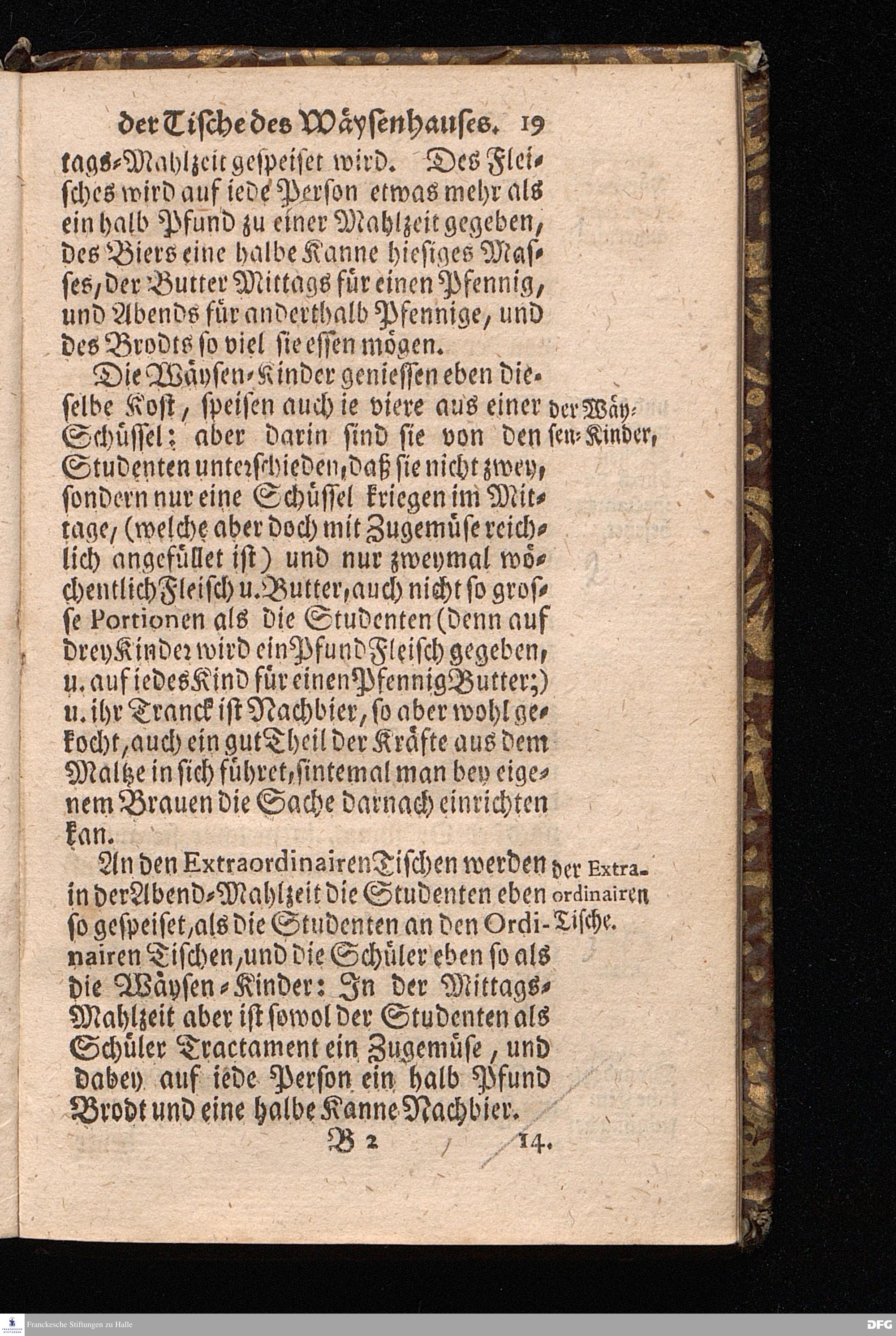 Der von GOTT in dem Wäysenhause zu Glaucha an Halle ietzo bey nahe für 600. Personen Zubereitete Tisch, Nach seinem Anfang, Fortgang, gegenwärtigem Zustand und eingeführter Tisch=Ordnung, kürtzlich beschrieben, mit angehängten Zwey Erweckungs=Reden, Deren die erste Anno 1699.[vielmehr 1700!] bey Einweihung des damaligen kleinern Speise=Saals, Die andere Anno 1711. bey Einweihung des grossen Saals gehalten worden, von August Hermann Francken / S.Theol.Prof.& Past.zu S.Ulrich / und des Gymnasii Scholarcha, [5.Auflage.] HALLE, in Verlegung des Wäysenhauses. 1722.