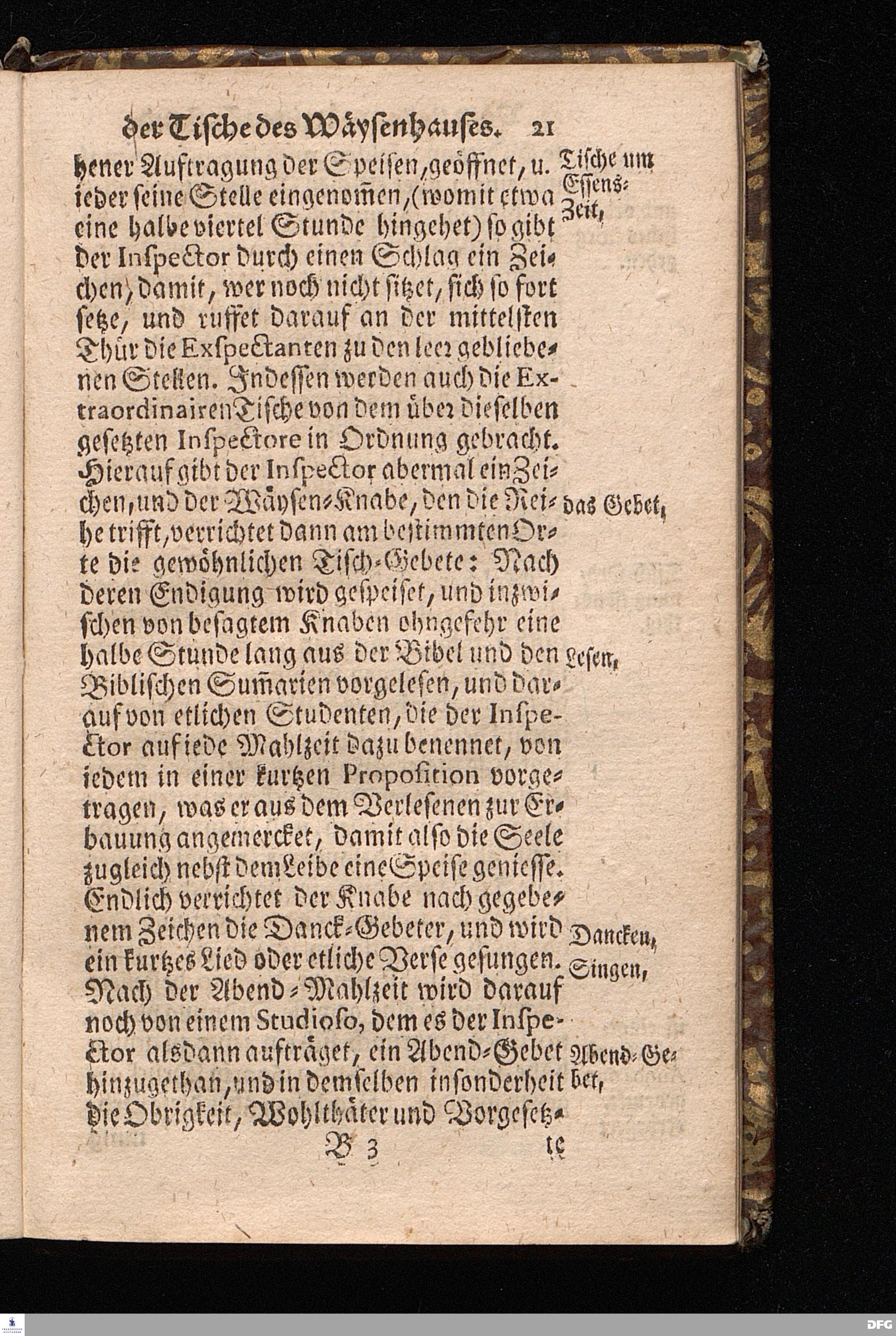 Der von GOTT in dem Wäysenhause zu Glaucha an Halle ietzo bey nahe für 600. Personen Zubereitete Tisch, Nach seinem Anfang, Fortgang, gegenwärtigem Zustand und eingeführter Tisch=Ordnung, kürtzlich beschrieben, mit angehängten Zwey Erweckungs=Reden, Deren die erste Anno 1699.[vielmehr 1700!] bey Einweihung des damaligen kleinern Speise=Saals, Die andere Anno 1711. bey Einweihung des grossen Saals gehalten worden, von August Hermann Francken / S.Theol.Prof.& Past.zu S.Ulrich / und des Gymnasii Scholarcha, [5.Auflage.] HALLE, in Verlegung des Wäysenhauses. 1722.
