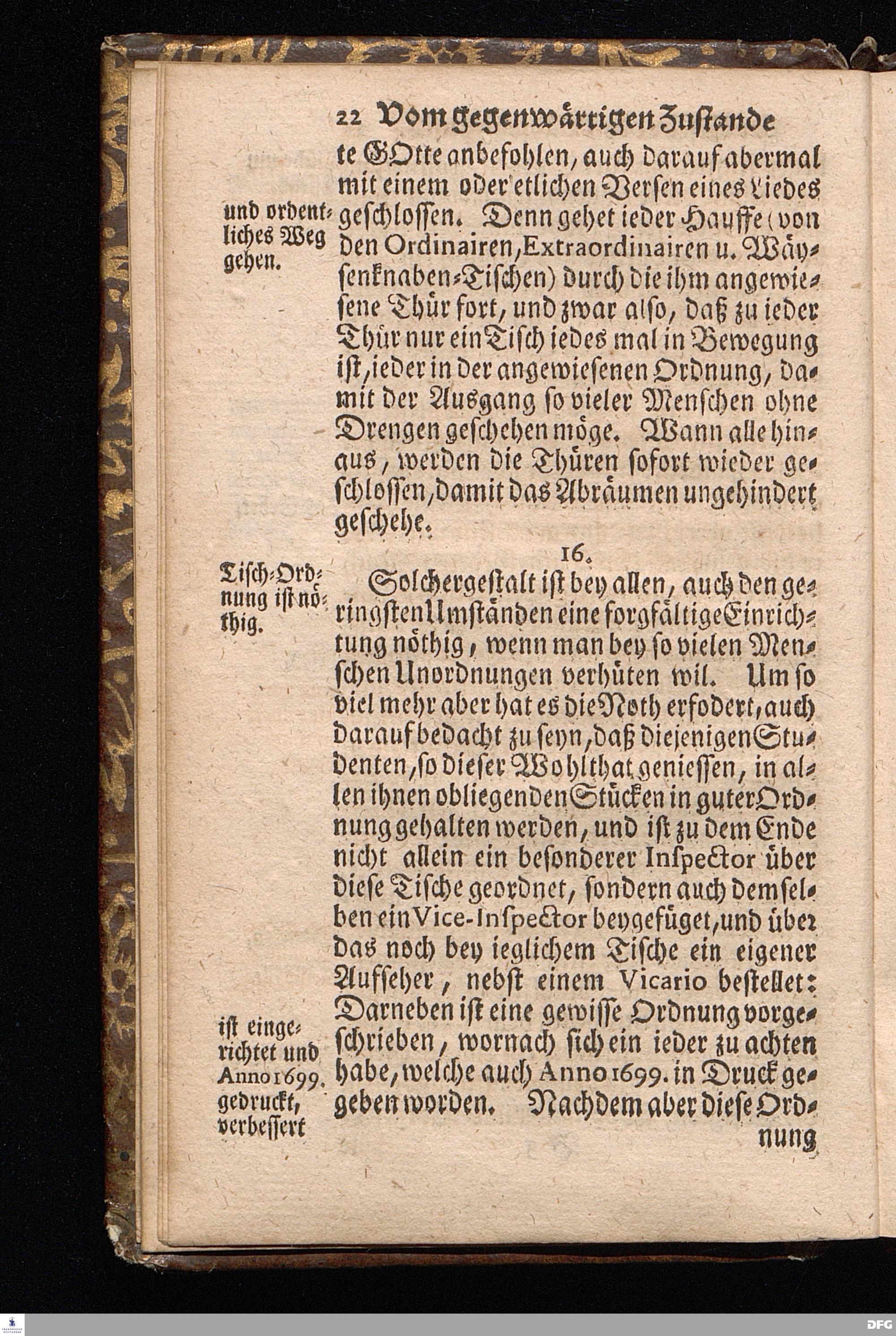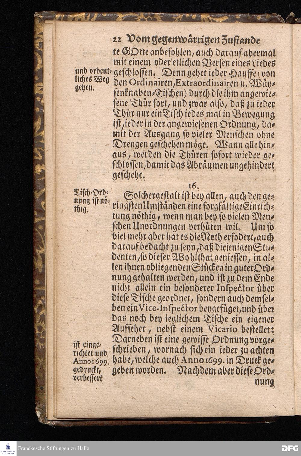 Der von GOTT in dem Wäysenhause zu Glaucha an Halle ietzo bey nahe für 600. Personen Zubereitete Tisch, Nach seinem Anfang, Fortgang, gegenwärtigem Zustand und eingeführter Tisch=Ordnung, kürtzlich beschrieben, mit angehängten Zwey Erweckungs=Reden, Deren die erste Anno 1699.[vielmehr 1700!] bey Einweihung des damaligen kleinern Speise=Saals, Die andere Anno 1711. bey Einweihung des grossen Saals gehalten worden, von August Hermann Francken / S.Theol.Prof.& Past.zu S.Ulrich / und des Gymnasii Scholarcha, [5.Auflage.] HALLE, in Verlegung des Wäysenhauses. 1722.