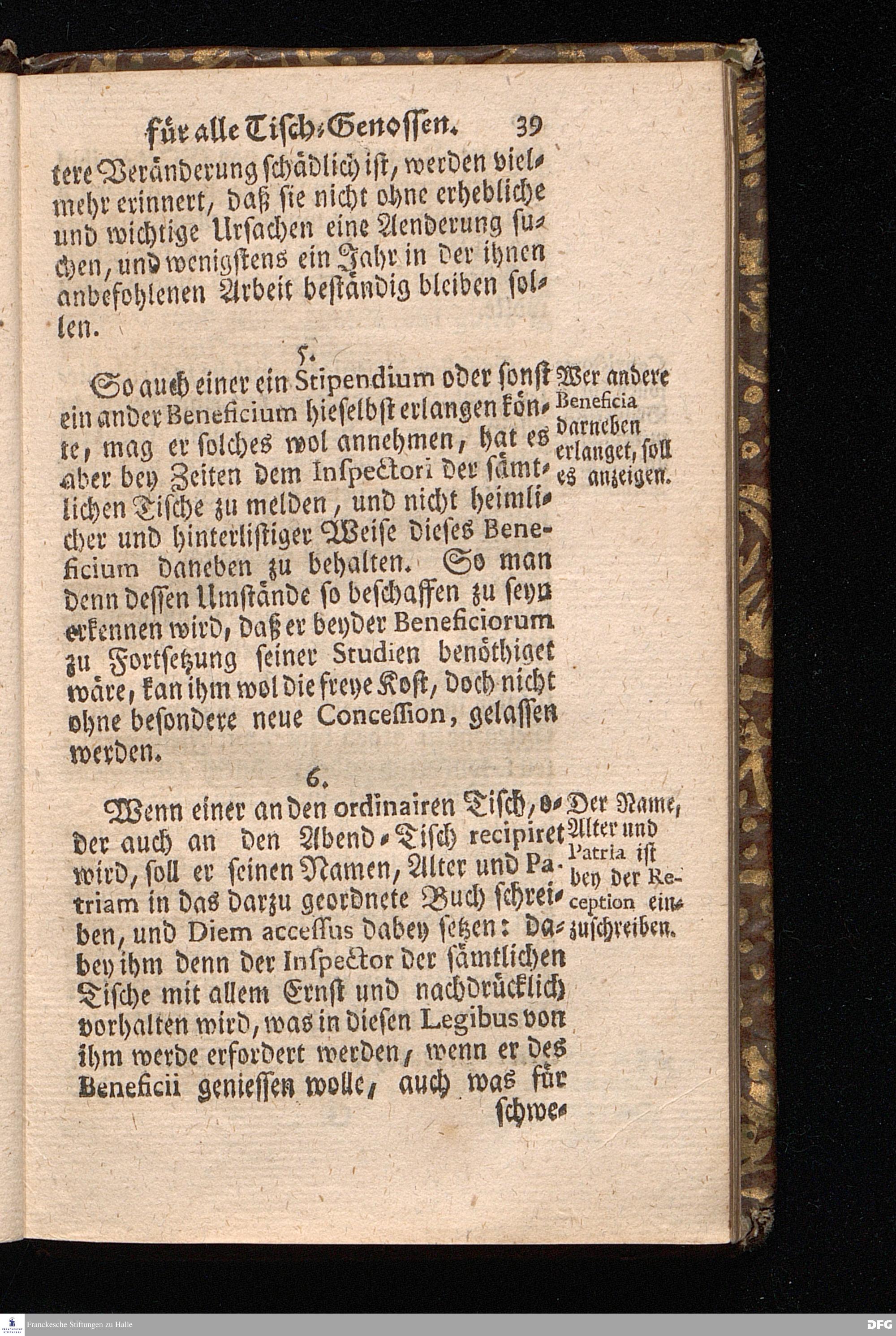 Der von GOTT in dem Wäysenhause zu Glaucha an Halle ietzo bey nahe für 600. Personen Zubereitete Tisch, Nach seinem Anfang, Fortgang, gegenwärtigem Zustand und eingeführter Tisch=Ordnung, kürtzlich beschrieben, mit angehängten Zwey Erweckungs=Reden, Deren die erste Anno 1699.[vielmehr 1700!] bey Einweihung des damaligen kleinern Speise=Saals, Die andere Anno 1711. bey Einweihung des grossen Saals gehalten worden, von August Hermann Francken / S.Theol.Prof.& Past.zu S.Ulrich / und des Gymnasii Scholarcha, [5.Auflage.] HALLE, in Verlegung des Wäysenhauses. 1722.