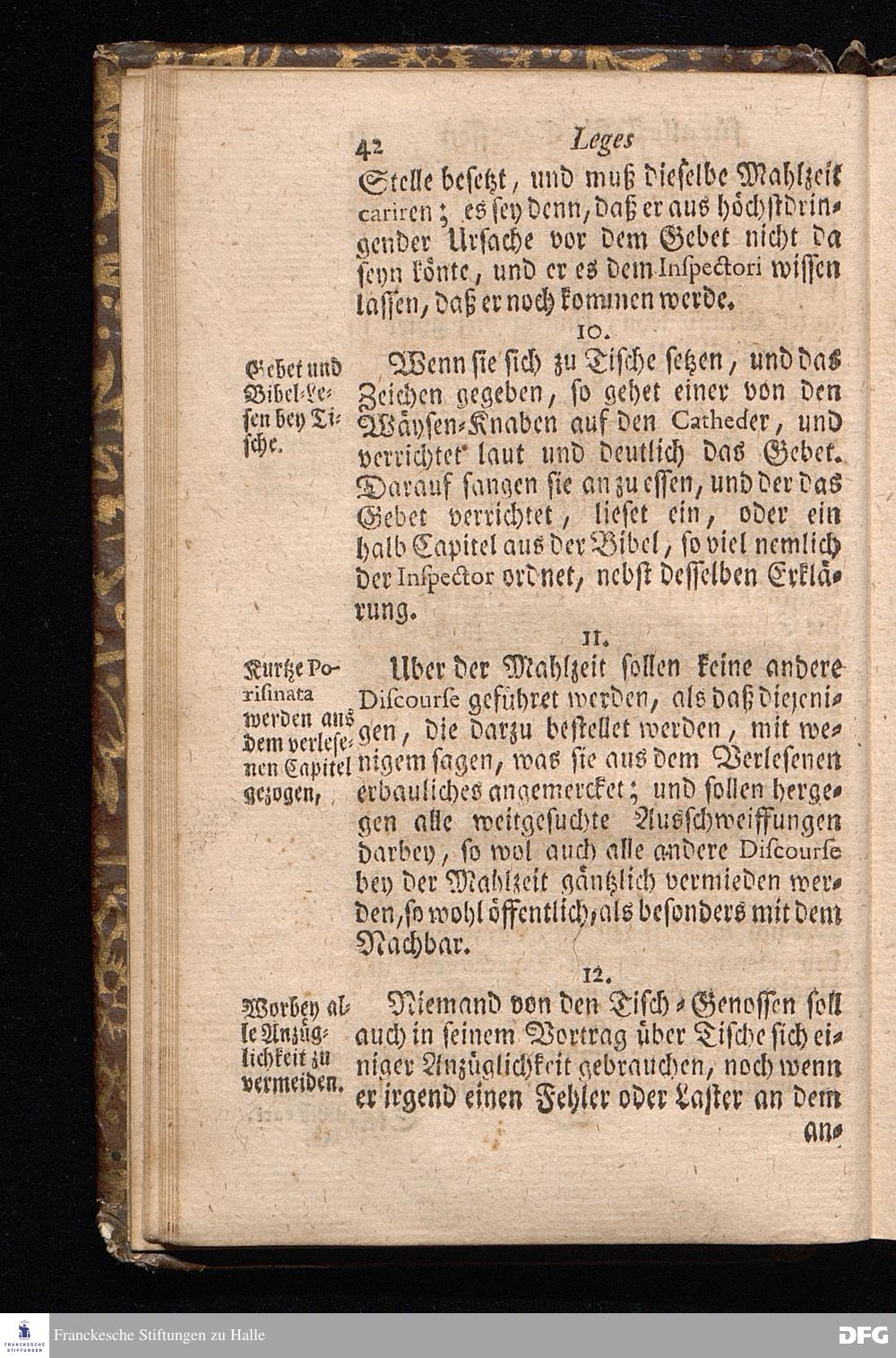 Der von GOTT in dem Wäysenhause zu Glaucha an Halle ietzo bey nahe für 600. Personen Zubereitete Tisch, Nach seinem Anfang, Fortgang, gegenwärtigem Zustand und eingeführter Tisch=Ordnung, kürtzlich beschrieben, mit angehängten Zwey Erweckungs=Reden, Deren die erste Anno 1699.[vielmehr 1700!] bey Einweihung des damaligen kleinern Speise=Saals, Die andere Anno 1711. bey Einweihung des grossen Saals gehalten worden, von August Hermann Francken / S.Theol.Prof.& Past.zu S.Ulrich / und des Gymnasii Scholarcha, [5.Auflage.] HALLE, in Verlegung des Wäysenhauses. 1722.