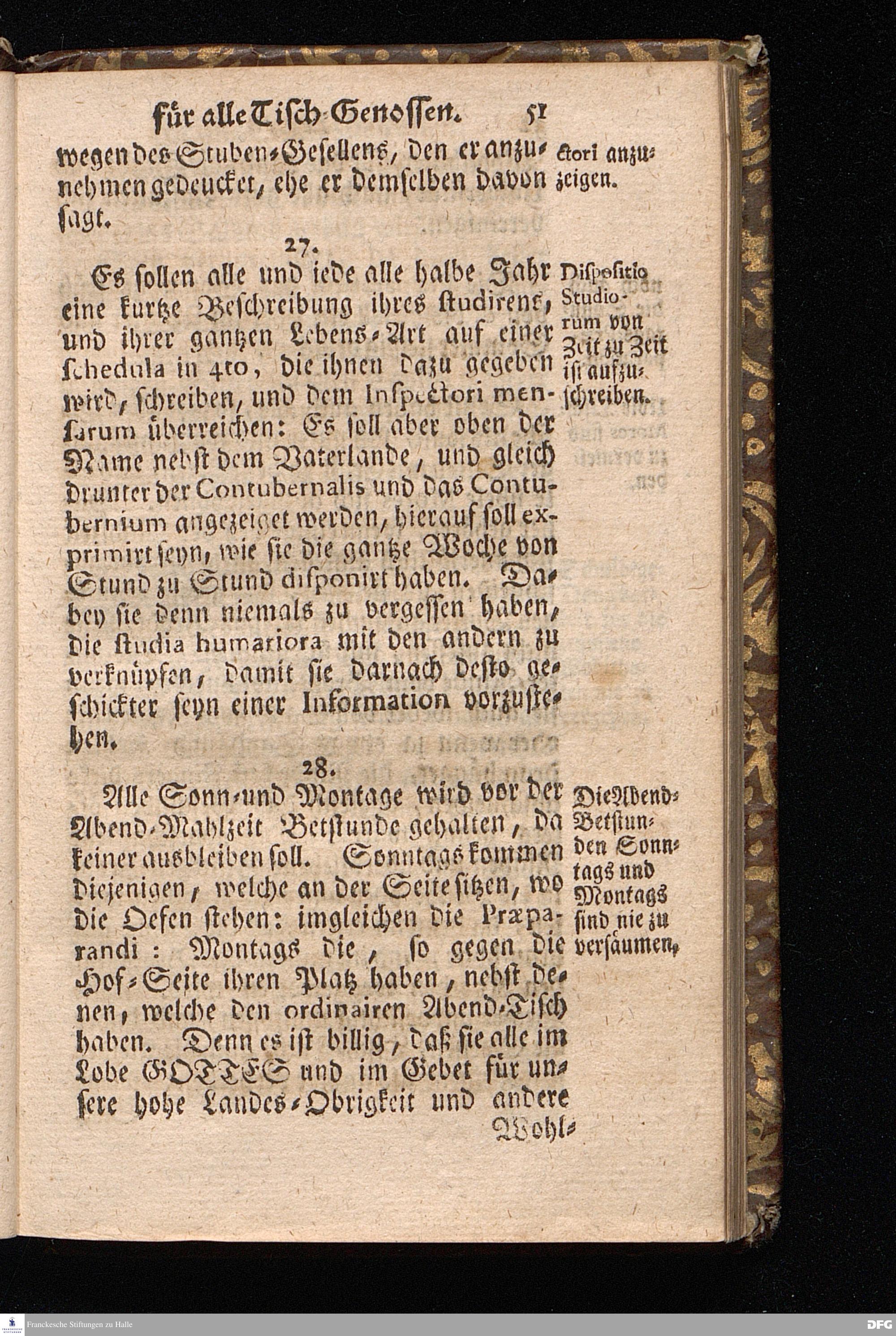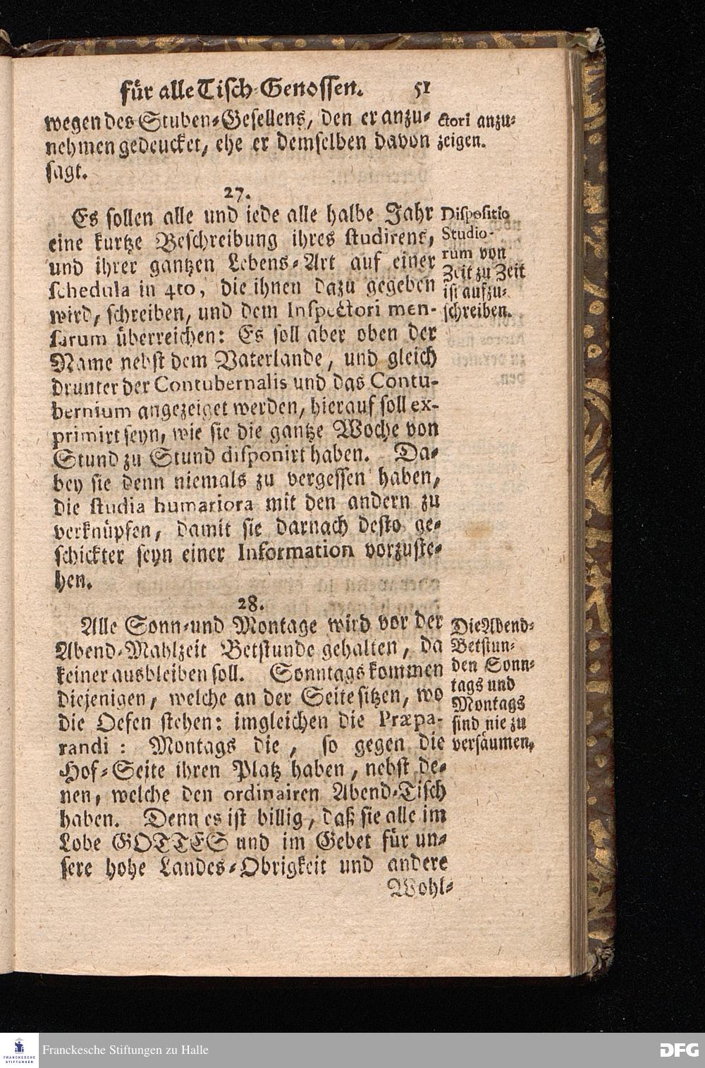 Der von GOTT in dem Wäysenhause zu Glaucha an Halle ietzo bey nahe für 600. Personen Zubereitete Tisch, Nach seinem Anfang, Fortgang, gegenwärtigem Zustand und eingeführter Tisch=Ordnung, kürtzlich beschrieben, mit angehängten Zwey Erweckungs=Reden, Deren die erste Anno 1699.[vielmehr 1700!] bey Einweihung des damaligen kleinern Speise=Saals, Die andere Anno 1711. bey Einweihung des grossen Saals gehalten worden, von August Hermann Francken / S.Theol.Prof.& Past.zu S.Ulrich / und des Gymnasii Scholarcha, [5.Auflage.] HALLE, in Verlegung des Wäysenhauses. 1722.