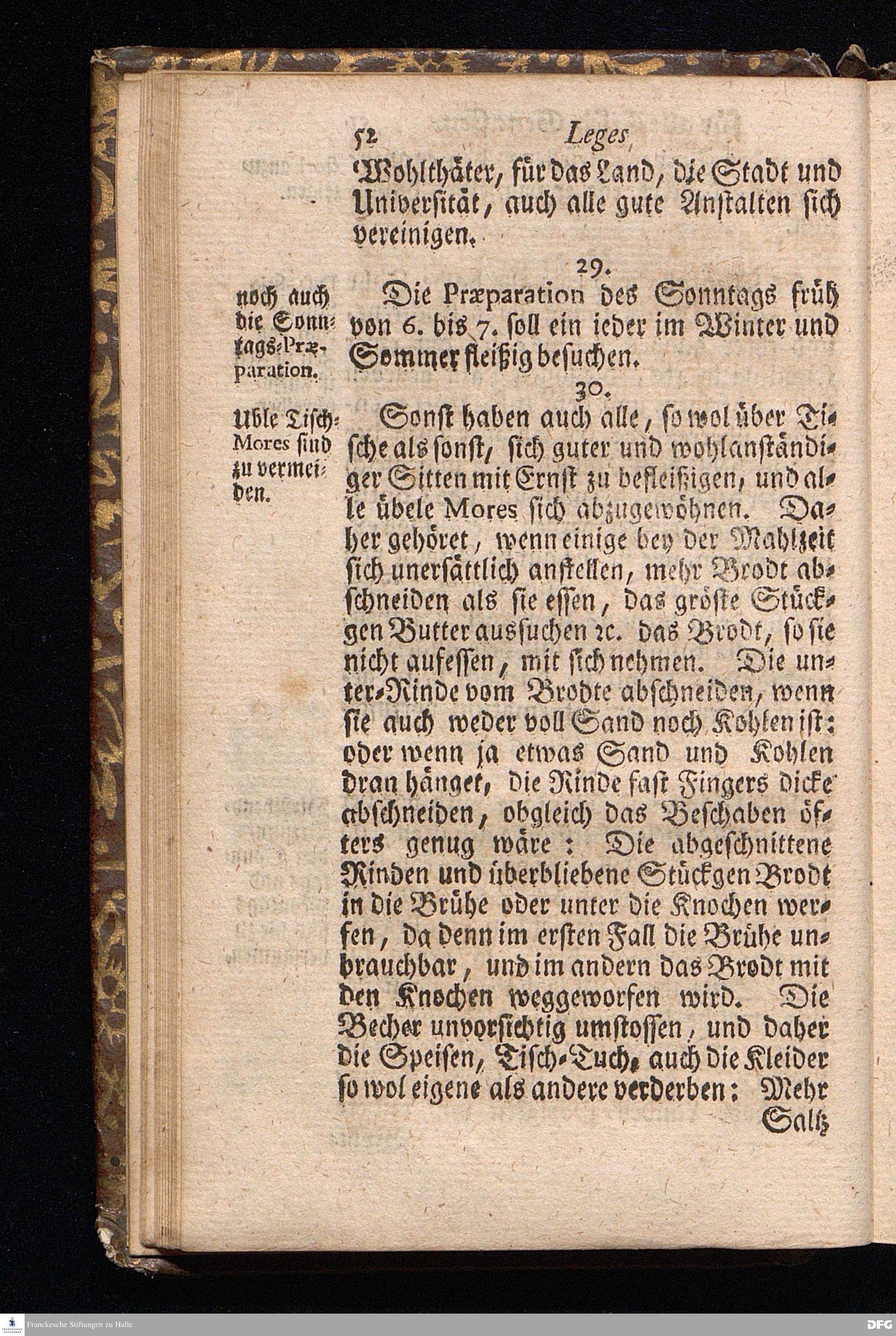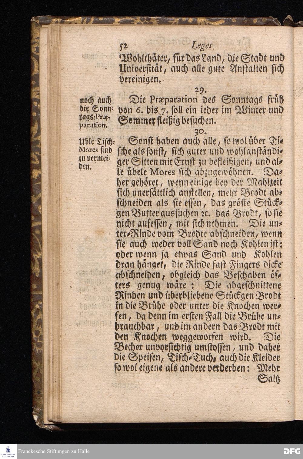 Der von GOTT in dem Wäysenhause zu Glaucha an Halle ietzo bey nahe für 600. Personen Zubereitete Tisch, Nach seinem Anfang, Fortgang, gegenwärtigem Zustand und eingeführter Tisch=Ordnung, kürtzlich beschrieben, mit angehängten Zwey Erweckungs=Reden, Deren die erste Anno 1699.[vielmehr 1700!] bey Einweihung des damaligen kleinern Speise=Saals, Die andere Anno 1711. bey Einweihung des grossen Saals gehalten worden, von August Hermann Francken / S.Theol.Prof.& Past.zu S.Ulrich / und des Gymnasii Scholarcha, [5.Auflage.] HALLE, in Verlegung des Wäysenhauses. 1722.