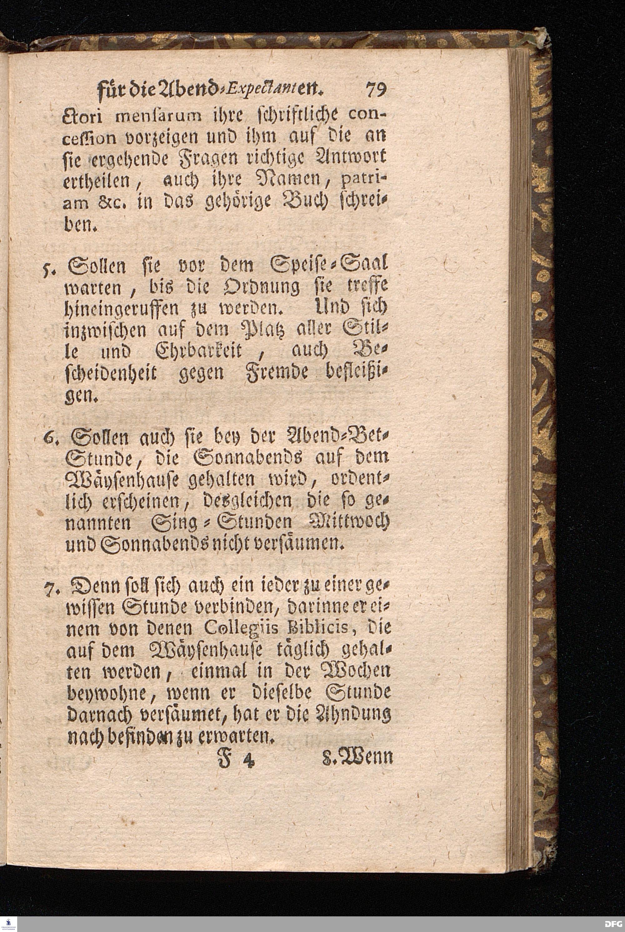 Der von GOTT in dem Wäysenhause zu Glaucha an Halle ietzo bey nahe für 600. Personen Zubereitete Tisch, Nach seinem Anfang, Fortgang, gegenwärtigem Zustand und eingeführter Tisch=Ordnung, kürtzlich beschrieben, mit angehängten Zwey Erweckungs=Reden, Deren die erste Anno 1699.[vielmehr 1700!] bey Einweihung des damaligen kleinern Speise=Saals, Die andere Anno 1711. bey Einweihung des grossen Saals gehalten worden, von August Hermann Francken / S.Theol.Prof.& Past.zu S.Ulrich / und des Gymnasii Scholarcha, [5.Auflage.] HALLE, in Verlegung des Wäysenhauses. 1722.