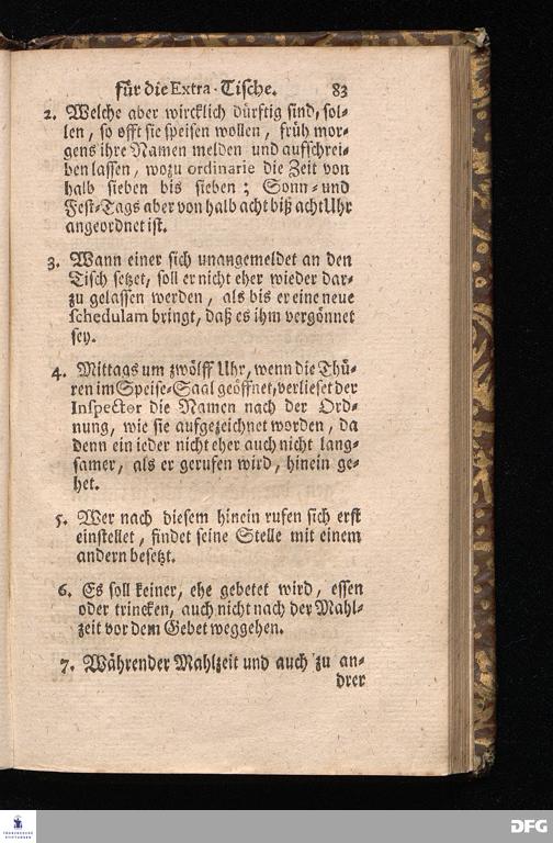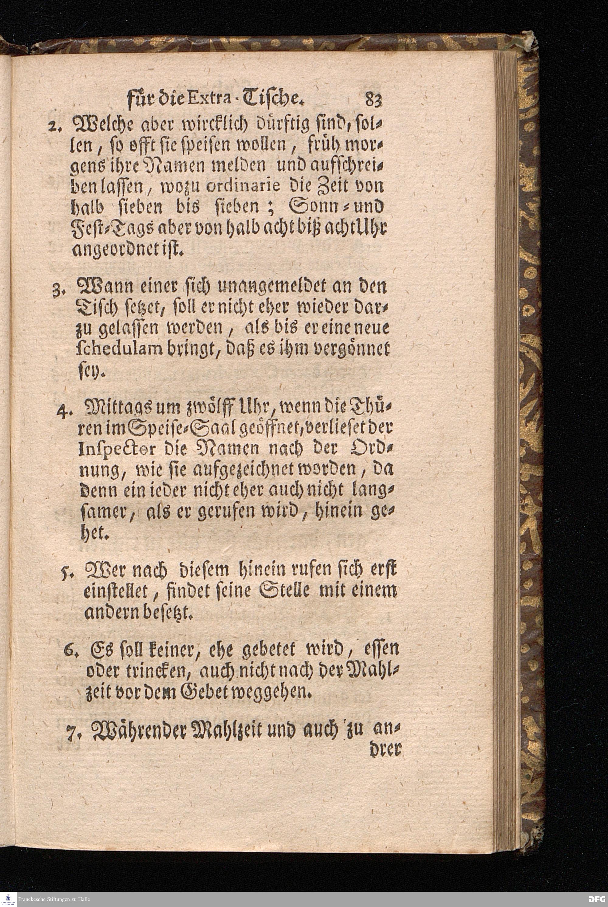 Der von GOTT in dem Wäysenhause zu Glaucha an Halle ietzo bey nahe für 600. Personen Zubereitete Tisch, Nach seinem Anfang, Fortgang, gegenwärtigem Zustand und eingeführter Tisch=Ordnung, kürtzlich beschrieben, mit angehängten Zwey Erweckungs=Reden, Deren die erste Anno 1699.[vielmehr 1700!] bey Einweihung des damaligen kleinern Speise=Saals, Die andere Anno 1711. bey Einweihung des grossen Saals gehalten worden, von August Hermann Francken / S.Theol.Prof.& Past.zu S.Ulrich / und des Gymnasii Scholarcha, [5.Auflage.] HALLE, in Verlegung des Wäysenhauses. 1722.