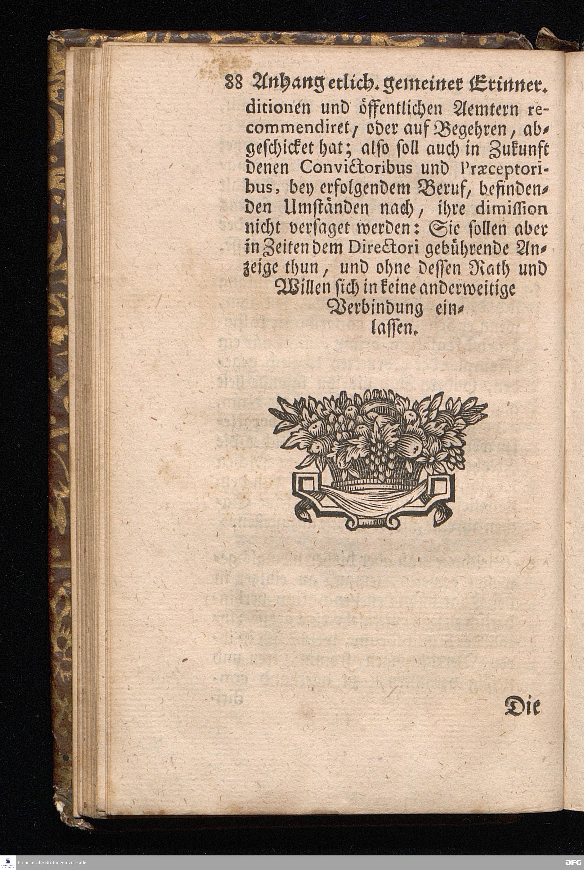 Der von GOTT in dem Wäysenhause zu Glaucha an Halle ietzo bey nahe für 600. Personen Zubereitete Tisch, Nach seinem Anfang, Fortgang, gegenwärtigem Zustand und eingeführter Tisch=Ordnung, kürtzlich beschrieben, mit angehängten Zwey Erweckungs=Reden, Deren die erste Anno 1699.[vielmehr 1700!] bey Einweihung des damaligen kleinern Speise=Saals, Die andere Anno 1711. bey Einweihung des grossen Saals gehalten worden, von August Hermann Francken / S.Theol.Prof.& Past.zu S.Ulrich / und des Gymnasii Scholarcha, [5.Auflage.] HALLE, in Verlegung des Wäysenhauses. 1722.