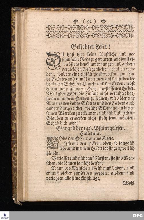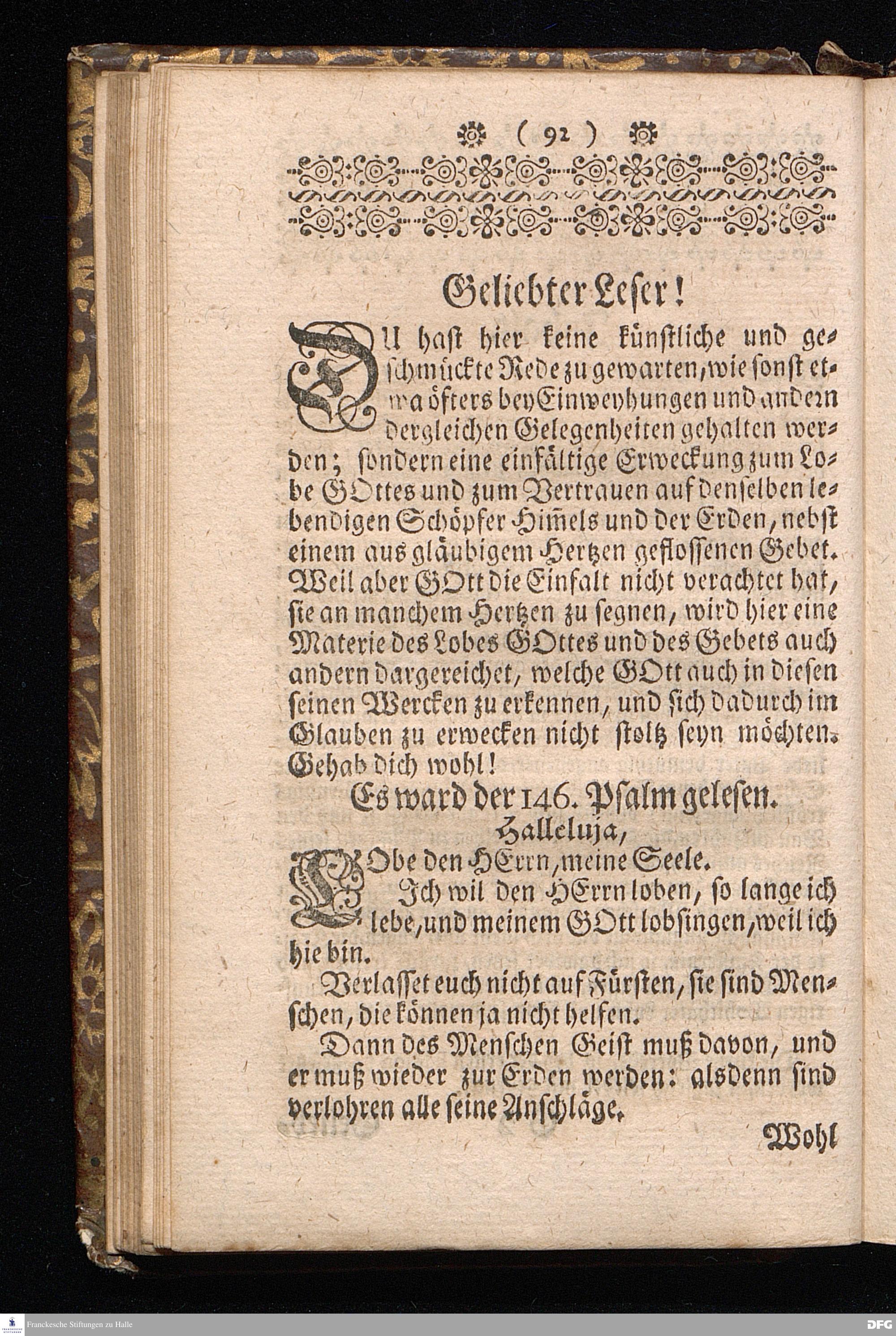 Der von GOTT in dem Wäysenhause zu Glaucha an Halle ietzo bey nahe für 600. Personen Zubereitete Tisch, Nach seinem Anfang, Fortgang, gegenwärtigem Zustand und eingeführter Tisch=Ordnung, kürtzlich beschrieben, mit angehängten Zwey Erweckungs=Reden, Deren die erste Anno 1699.[vielmehr 1700!] bey Einweihung des damaligen kleinern Speise=Saals, Die andere Anno 1711. bey Einweihung des grossen Saals gehalten worden, von August Hermann Francken / S.Theol.Prof.& Past.zu S.Ulrich / und des Gymnasii Scholarcha, [5.Auflage.] HALLE, in Verlegung des Wäysenhauses. 1722.