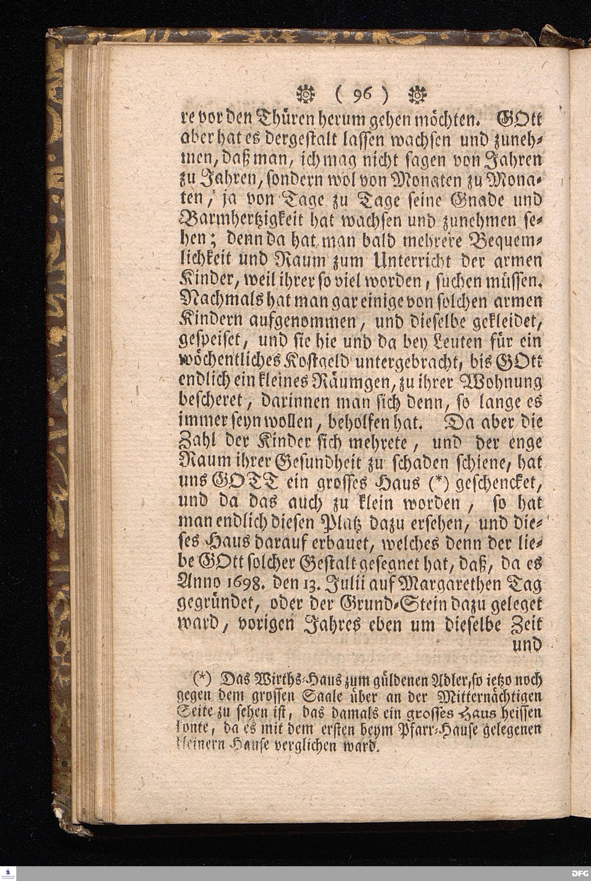 Der von GOTT in dem Wäysenhause zu Glaucha an Halle ietzo bey nahe für 600. Personen Zubereitete Tisch, Nach seinem Anfang, Fortgang, gegenwärtigem Zustand und eingeführter Tisch=Ordnung, kürtzlich beschrieben, mit angehängten Zwey Erweckungs=Reden, Deren die erste Anno 1699.[vielmehr 1700!] bey Einweihung des damaligen kleinern Speise=Saals, Die andere Anno 1711. bey Einweihung des grossen Saals gehalten worden, von August Hermann Francken / S.Theol.Prof.& Past.zu S.Ulrich / und des Gymnasii Scholarcha, [5.Auflage.] HALLE, in Verlegung des Wäysenhauses. 1722.