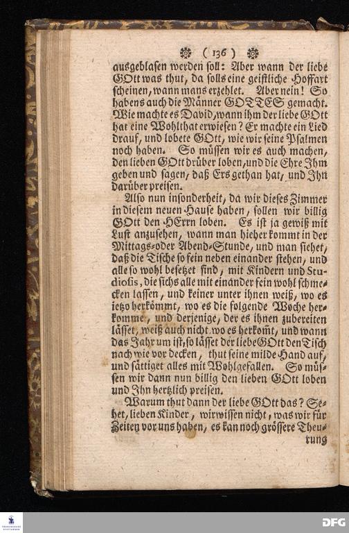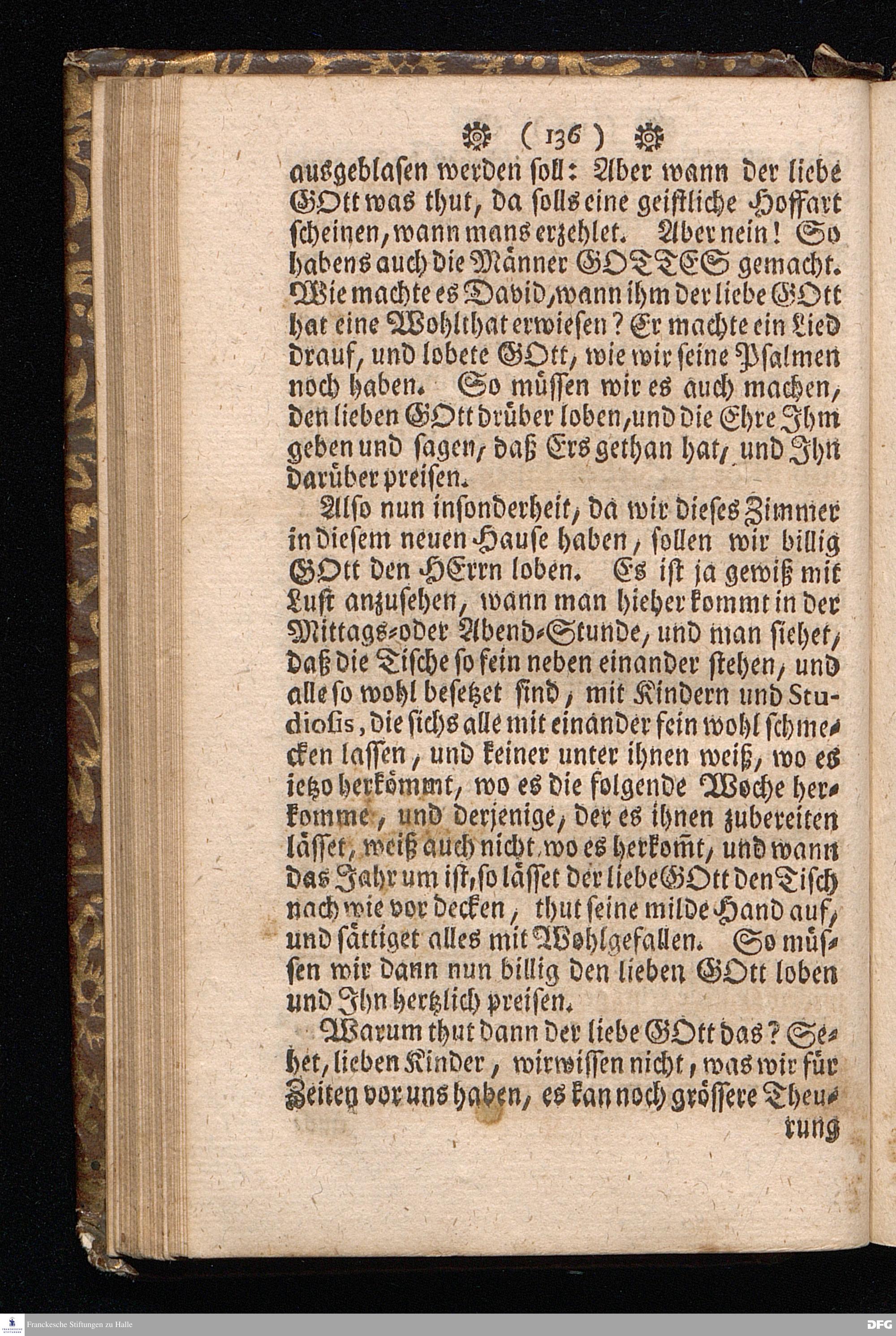 Der von GOTT in dem Wäysenhause zu Glaucha an Halle ietzo bey nahe für 600. Personen Zubereitete Tisch, Nach seinem Anfang, Fortgang, gegenwärtigem Zustand und eingeführter Tisch=Ordnung, kürtzlich beschrieben, mit angehängten Zwey Erweckungs=Reden, Deren die erste Anno 1699.[vielmehr 1700!] bey Einweihung des damaligen kleinern Speise=Saals, Die andere Anno 1711. bey Einweihung des grossen Saals gehalten worden, von August Hermann Francken / S.Theol.Prof.& Past.zu S.Ulrich / und des Gymnasii Scholarcha, [5.Auflage.] HALLE, in Verlegung des Wäysenhauses. 1722.