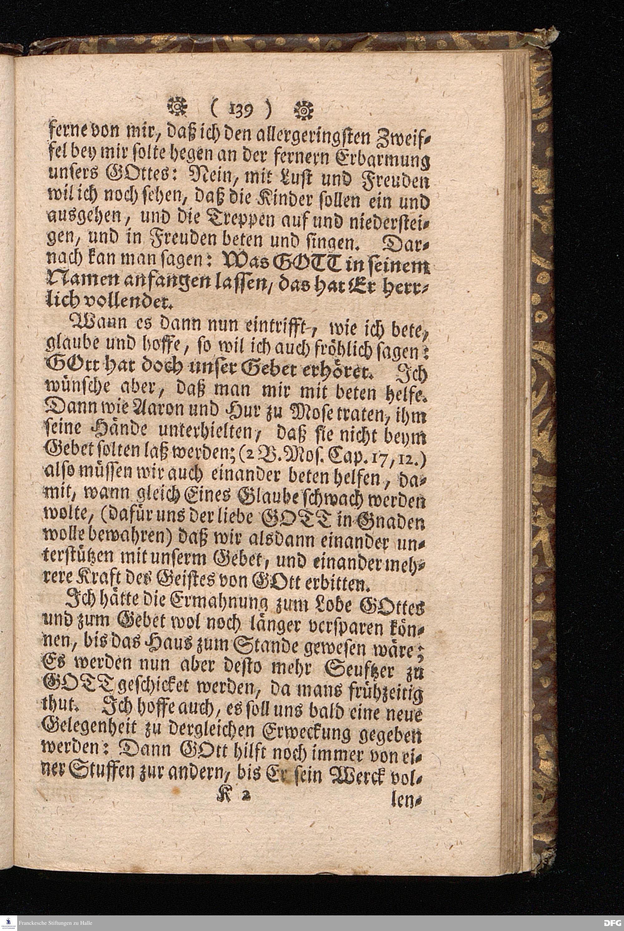 Der von GOTT in dem Wäysenhause zu Glaucha an Halle ietzo bey nahe für 600. Personen Zubereitete Tisch, Nach seinem Anfang, Fortgang, gegenwärtigem Zustand und eingeführter Tisch=Ordnung, kürtzlich beschrieben, mit angehängten Zwey Erweckungs=Reden, Deren die erste Anno 1699.[vielmehr 1700!] bey Einweihung des damaligen kleinern Speise=Saals, Die andere Anno 1711. bey Einweihung des grossen Saals gehalten worden, von August Hermann Francken / S.Theol.Prof.& Past.zu S.Ulrich / und des Gymnasii Scholarcha, [5.Auflage.] HALLE, in Verlegung des Wäysenhauses. 1722.