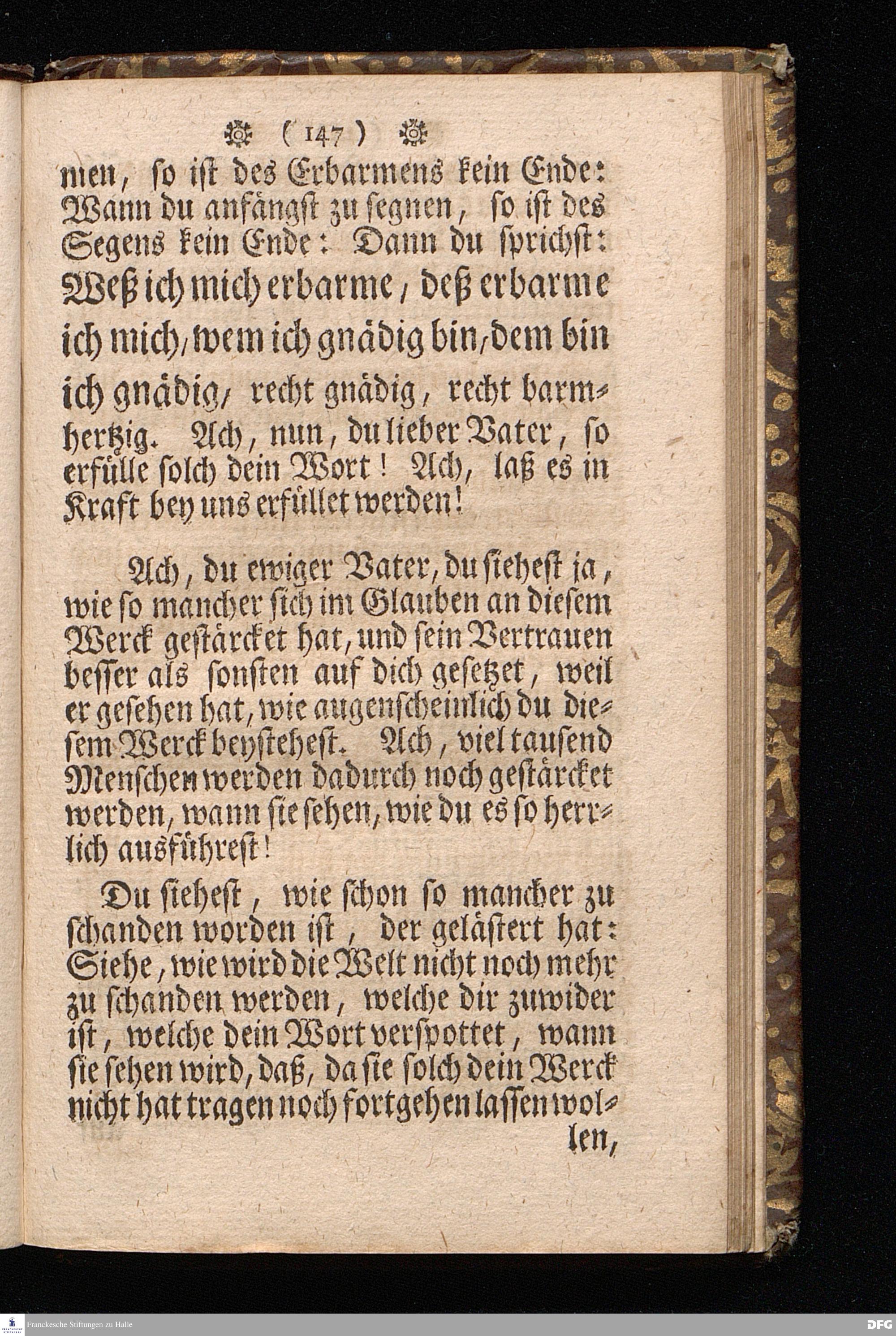 Der von GOTT in dem Wäysenhause zu Glaucha an Halle ietzo bey nahe für 600. Personen Zubereitete Tisch, Nach seinem Anfang, Fortgang, gegenwärtigem Zustand und eingeführter Tisch=Ordnung, kürtzlich beschrieben, mit angehängten Zwey Erweckungs=Reden, Deren die erste Anno 1699.[vielmehr 1700!] bey Einweihung des damaligen kleinern Speise=Saals, Die andere Anno 1711. bey Einweihung des grossen Saals gehalten worden, von August Hermann Francken / S.Theol.Prof.& Past.zu S.Ulrich / und des Gymnasii Scholarcha, [5.Auflage.] HALLE, in Verlegung des Wäysenhauses. 1722.