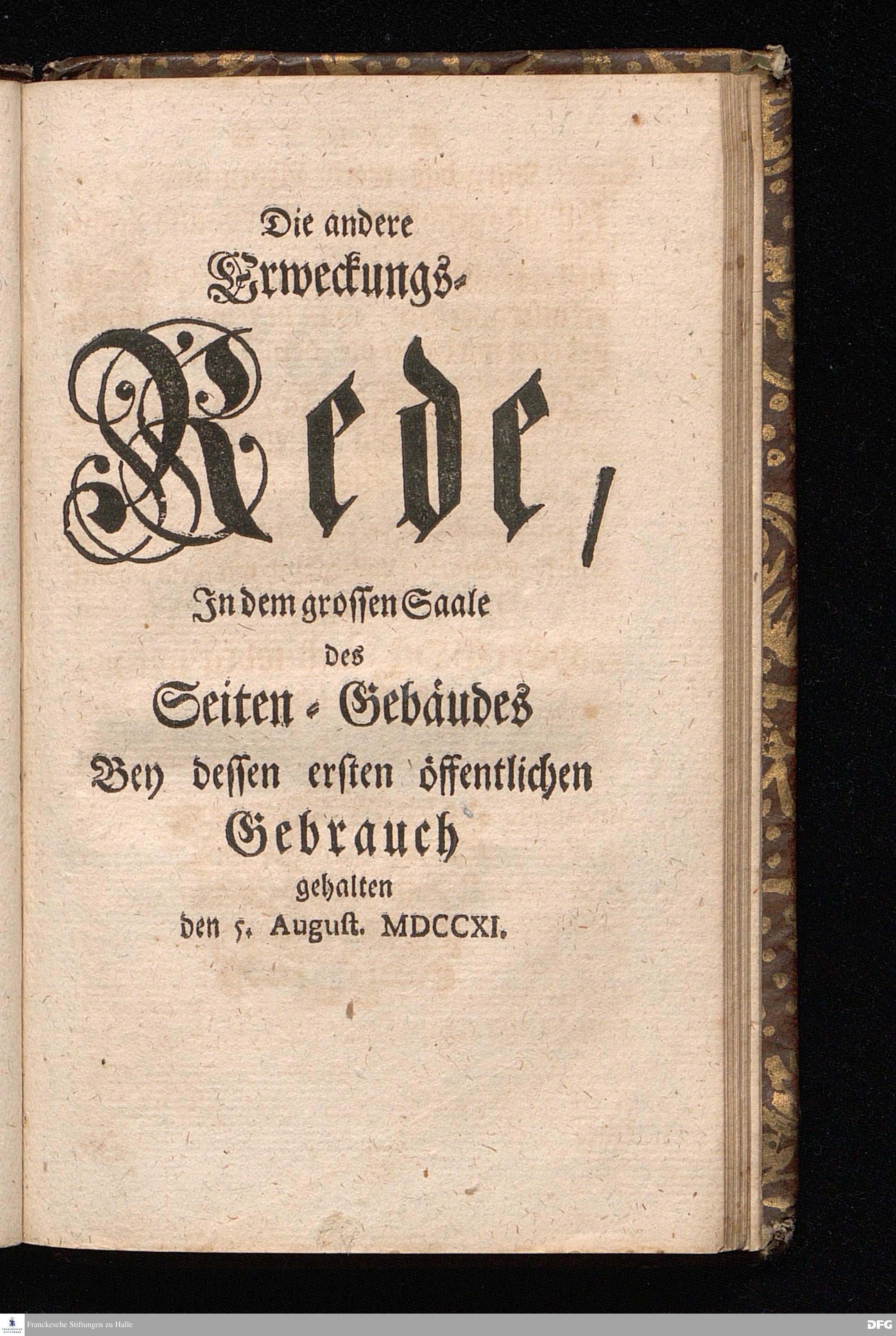 Der von GOTT in dem Wäysenhause zu Glaucha an Halle ietzo bey nahe für 600. Personen Zubereitete Tisch, Nach seinem Anfang, Fortgang, gegenwärtigem Zustand und eingeführter Tisch=Ordnung, kürtzlich beschrieben, mit angehängten Zwey Erweckungs=Reden, Deren die erste Anno 1699.[vielmehr 1700!] bey Einweihung des damaligen kleinern Speise=Saals, Die andere Anno 1711. bey Einweihung des grossen Saals gehalten worden, von August Hermann Francken / S.Theol.Prof.& Past.zu S.Ulrich / und des Gymnasii Scholarcha, [5.Auflage.] HALLE, in Verlegung des Wäysenhauses. 1722.