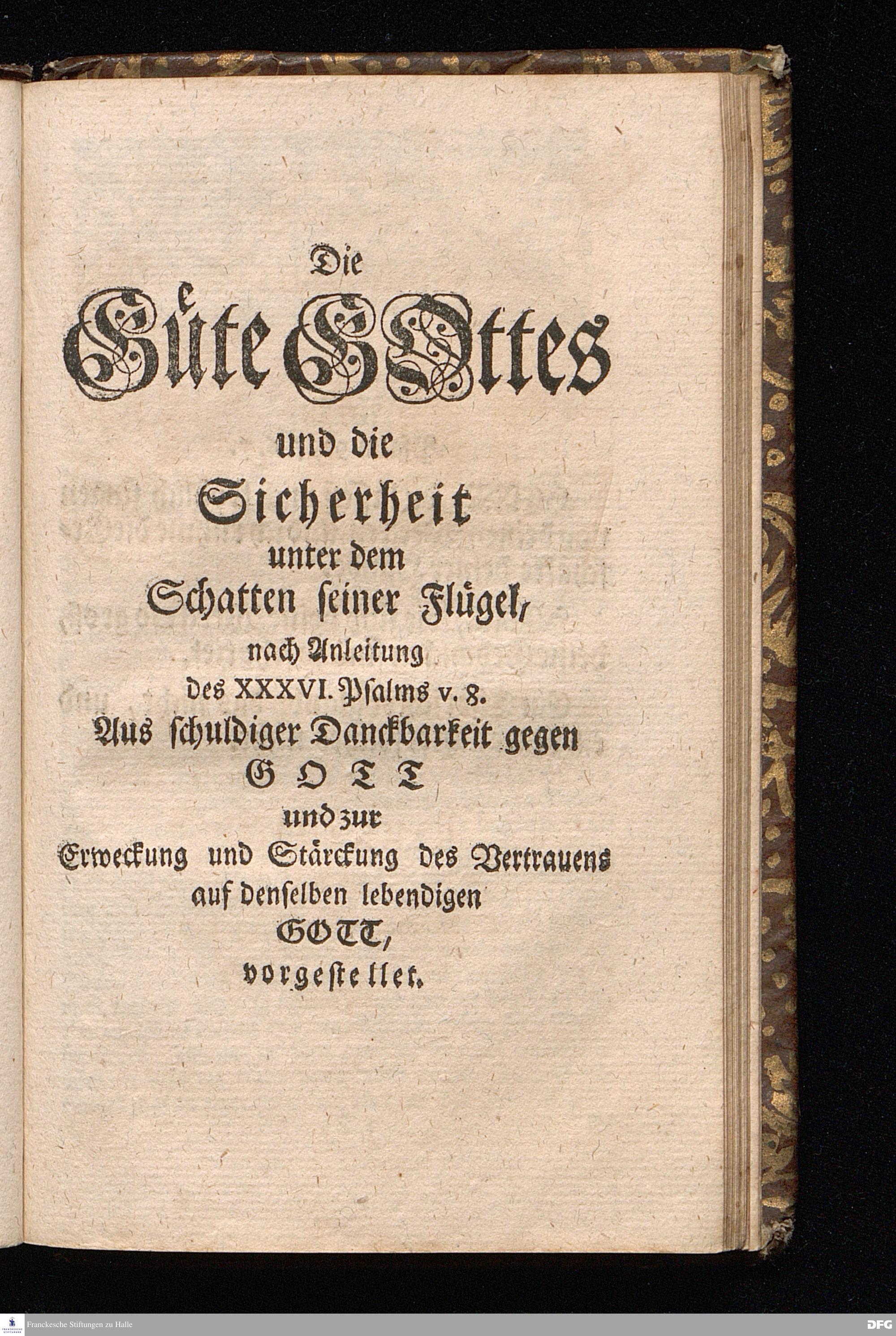 Der von GOTT in dem Wäysenhause zu Glaucha an Halle ietzo bey nahe für 600. Personen Zubereitete Tisch, Nach seinem Anfang, Fortgang, gegenwärtigem Zustand und eingeführter Tisch=Ordnung, kürtzlich beschrieben, mit angehängten Zwey Erweckungs=Reden, Deren die erste Anno 1699.[vielmehr 1700!] bey Einweihung des damaligen kleinern Speise=Saals, Die andere Anno 1711. bey Einweihung des grossen Saals gehalten worden, von August Hermann Francken / S.Theol.Prof.& Past.zu S.Ulrich / und des Gymnasii Scholarcha, [5.Auflage.] HALLE, in Verlegung des Wäysenhauses. 1722.