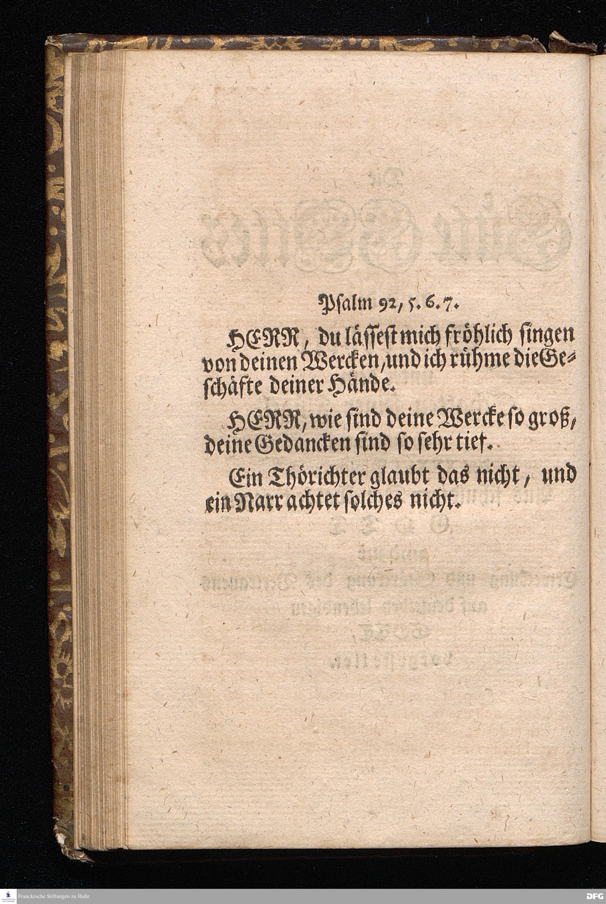 Der von GOTT in dem Wäysenhause zu Glaucha an Halle ietzo bey nahe für 600. Personen Zubereitete Tisch, Nach seinem Anfang, Fortgang, gegenwärtigem Zustand und eingeführter Tisch=Ordnung, kürtzlich beschrieben, mit angehängten Zwey Erweckungs=Reden, Deren die erste Anno 1699.[vielmehr 1700!] bey Einweihung des damaligen kleinern Speise=Saals, Die andere Anno 1711. bey Einweihung des grossen Saals gehalten worden, von August Hermann Francken / S.Theol.Prof.& Past.zu S.Ulrich / und des Gymnasii Scholarcha, [5.Auflage.] HALLE, in Verlegung des Wäysenhauses. 1722.
