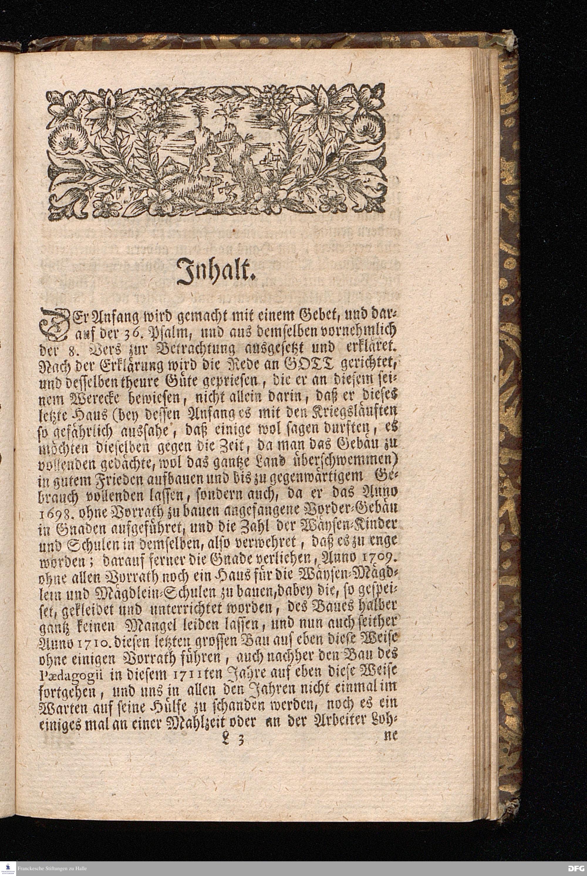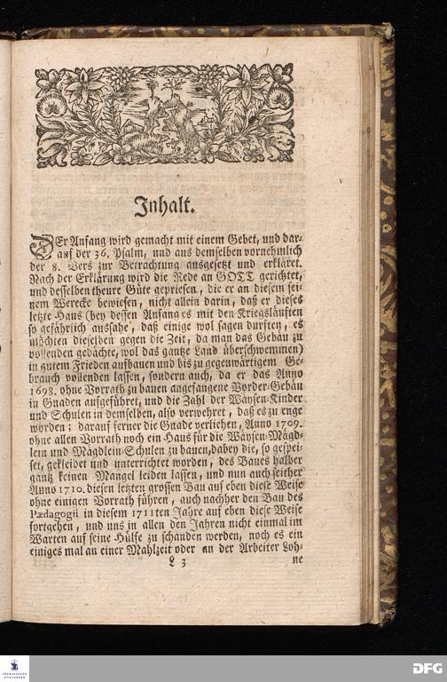 Der von GOTT in dem Wäysenhause zu Glaucha an Halle ietzo bey nahe für 600. Personen Zubereitete Tisch, Nach seinem Anfang, Fortgang, gegenwärtigem Zustand und eingeführter Tisch=Ordnung, kürtzlich beschrieben, mit angehängten Zwey Erweckungs=Reden, Deren die erste Anno 1699.[vielmehr 1700!] bey Einweihung des damaligen kleinern Speise=Saals, Die andere Anno 1711. bey Einweihung des grossen Saals gehalten worden, von August Hermann Francken / S.Theol.Prof.& Past.zu S.Ulrich / und des Gymnasii Scholarcha, [5.Auflage.] HALLE, in Verlegung des Wäysenhauses. 1722.