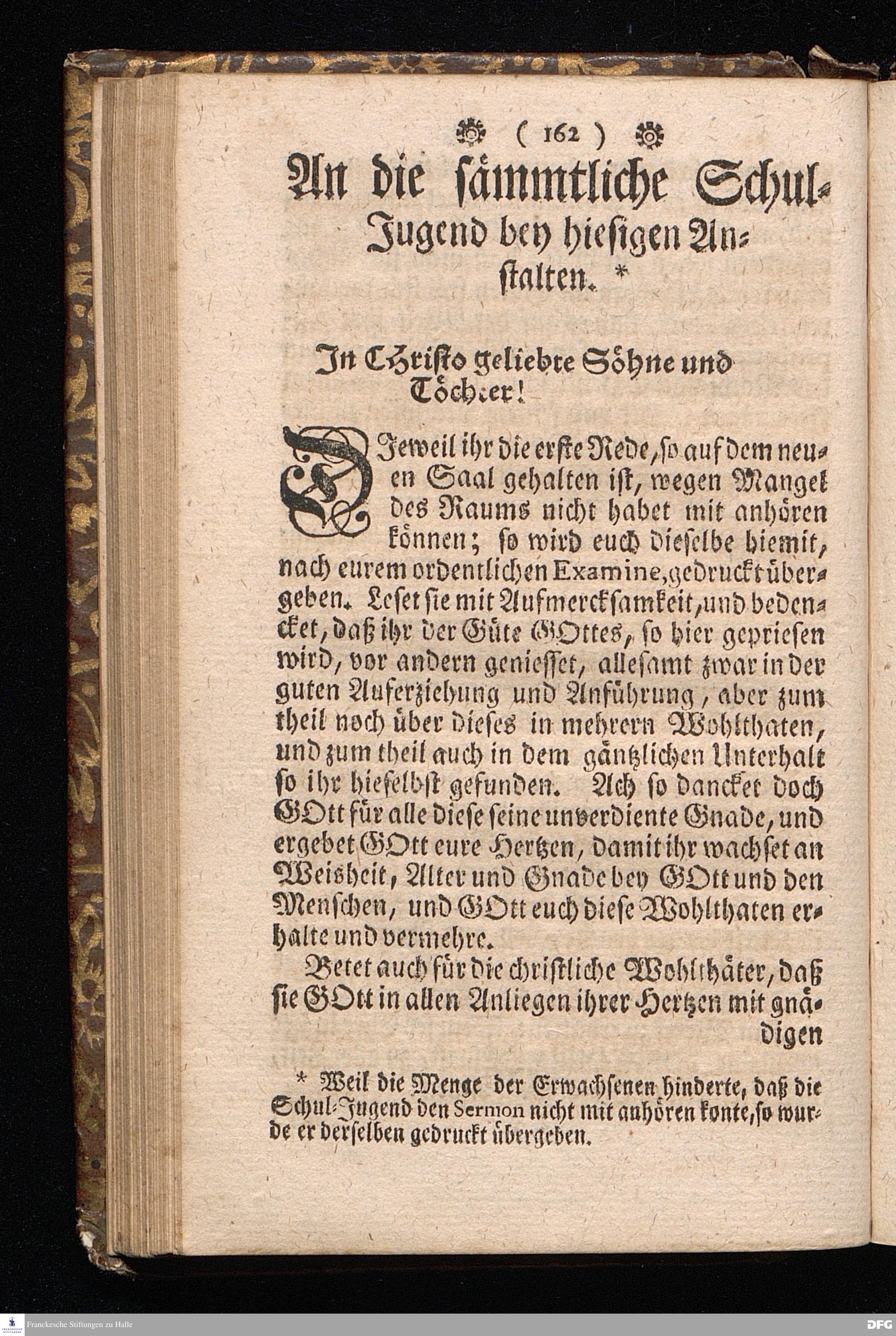Der von GOTT in dem Wäysenhause zu Glaucha an Halle ietzo bey nahe für 600. Personen Zubereitete Tisch, Nach seinem Anfang, Fortgang, gegenwärtigem Zustand und eingeführter Tisch=Ordnung, kürtzlich beschrieben, mit angehängten Zwey Erweckungs=Reden, Deren die erste Anno 1699.[vielmehr 1700!] bey Einweihung des damaligen kleinern Speise=Saals, Die andere Anno 1711. bey Einweihung des grossen Saals gehalten worden, von August Hermann Francken / S.Theol.Prof.& Past.zu S.Ulrich / und des Gymnasii Scholarcha, [5.Auflage.] HALLE, in Verlegung des Wäysenhauses. 1722.