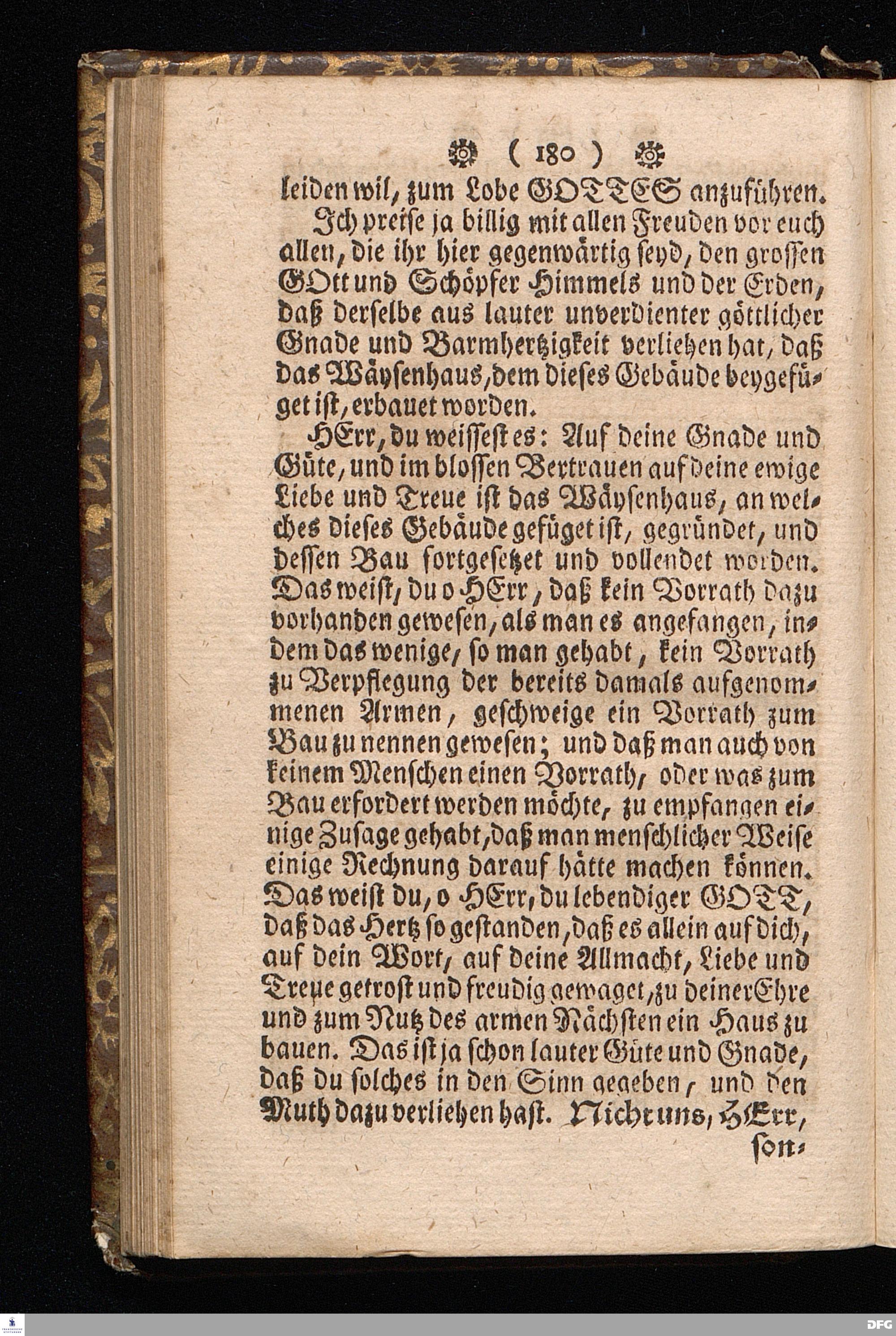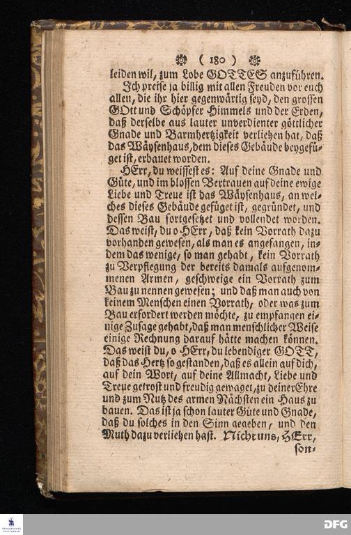 Der von GOTT in dem Wäysenhause zu Glaucha an Halle ietzo bey nahe für 600. Personen Zubereitete Tisch, Nach seinem Anfang, Fortgang, gegenwärtigem Zustand und eingeführter Tisch=Ordnung, kürtzlich beschrieben, mit angehängten Zwey Erweckungs=Reden, Deren die erste Anno 1699.[vielmehr 1700!] bey Einweihung des damaligen kleinern Speise=Saals, Die andere Anno 1711. bey Einweihung des grossen Saals gehalten worden, von August Hermann Francken / S.Theol.Prof.& Past.zu S.Ulrich / und des Gymnasii Scholarcha, [5.Auflage.] HALLE, in Verlegung des Wäysenhauses. 1722.