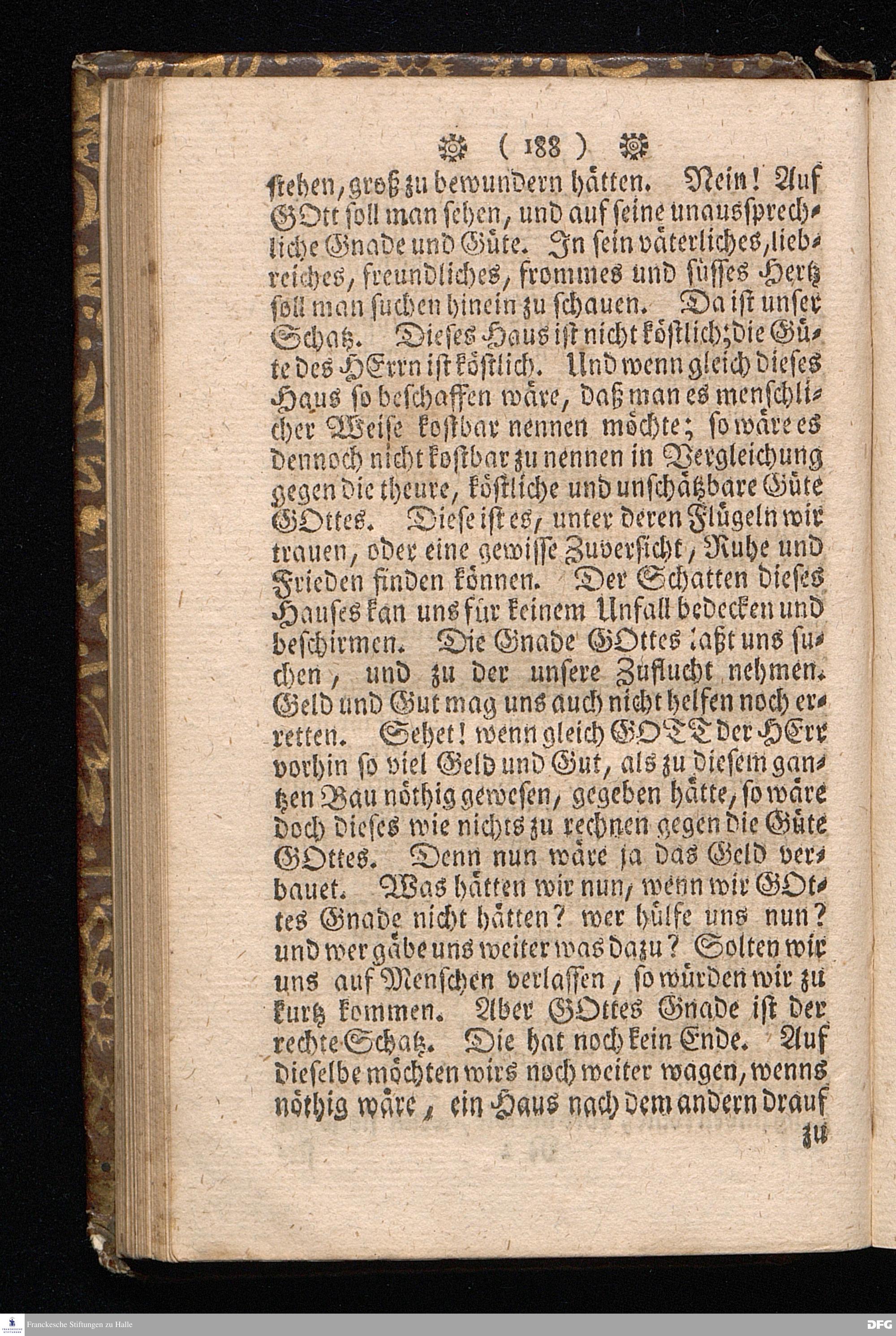 Der von GOTT in dem Wäysenhause zu Glaucha an Halle ietzo bey nahe für 600. Personen Zubereitete Tisch, Nach seinem Anfang, Fortgang, gegenwärtigem Zustand und eingeführter Tisch=Ordnung, kürtzlich beschrieben, mit angehängten Zwey Erweckungs=Reden, Deren die erste Anno 1699.[vielmehr 1700!] bey Einweihung des damaligen kleinern Speise=Saals, Die andere Anno 1711. bey Einweihung des grossen Saals gehalten worden, von August Hermann Francken / S.Theol.Prof.& Past.zu S.Ulrich / und des Gymnasii Scholarcha, [5.Auflage.] HALLE, in Verlegung des Wäysenhauses. 1722.