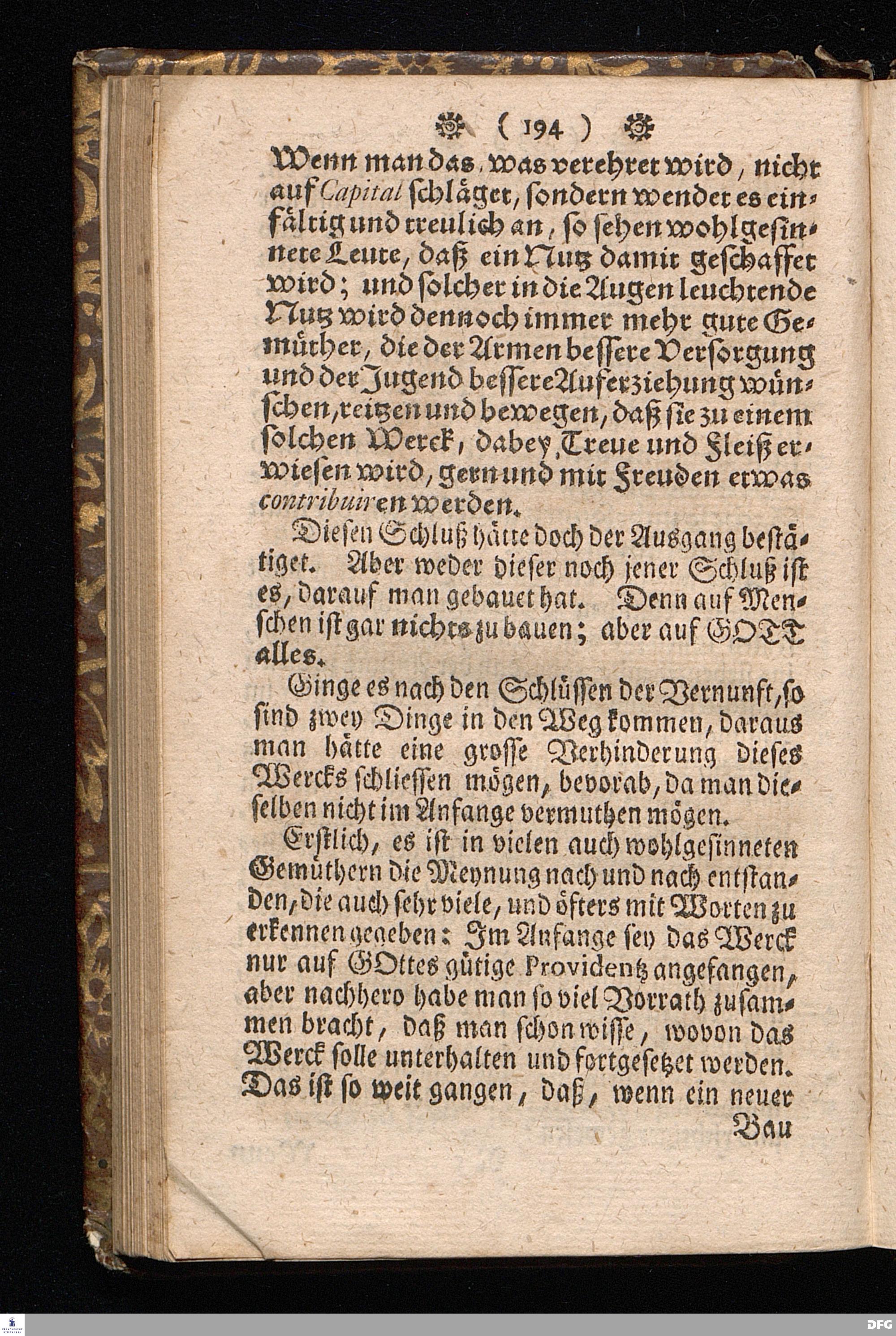 Der von GOTT in dem Wäysenhause zu Glaucha an Halle ietzo bey nahe für 600. Personen Zubereitete Tisch, Nach seinem Anfang, Fortgang, gegenwärtigem Zustand und eingeführter Tisch=Ordnung, kürtzlich beschrieben, mit angehängten Zwey Erweckungs=Reden, Deren die erste Anno 1699.[vielmehr 1700!] bey Einweihung des damaligen kleinern Speise=Saals, Die andere Anno 1711. bey Einweihung des grossen Saals gehalten worden, von August Hermann Francken / S.Theol.Prof.& Past.zu S.Ulrich / und des Gymnasii Scholarcha, [5.Auflage.] HALLE, in Verlegung des Wäysenhauses. 1722.