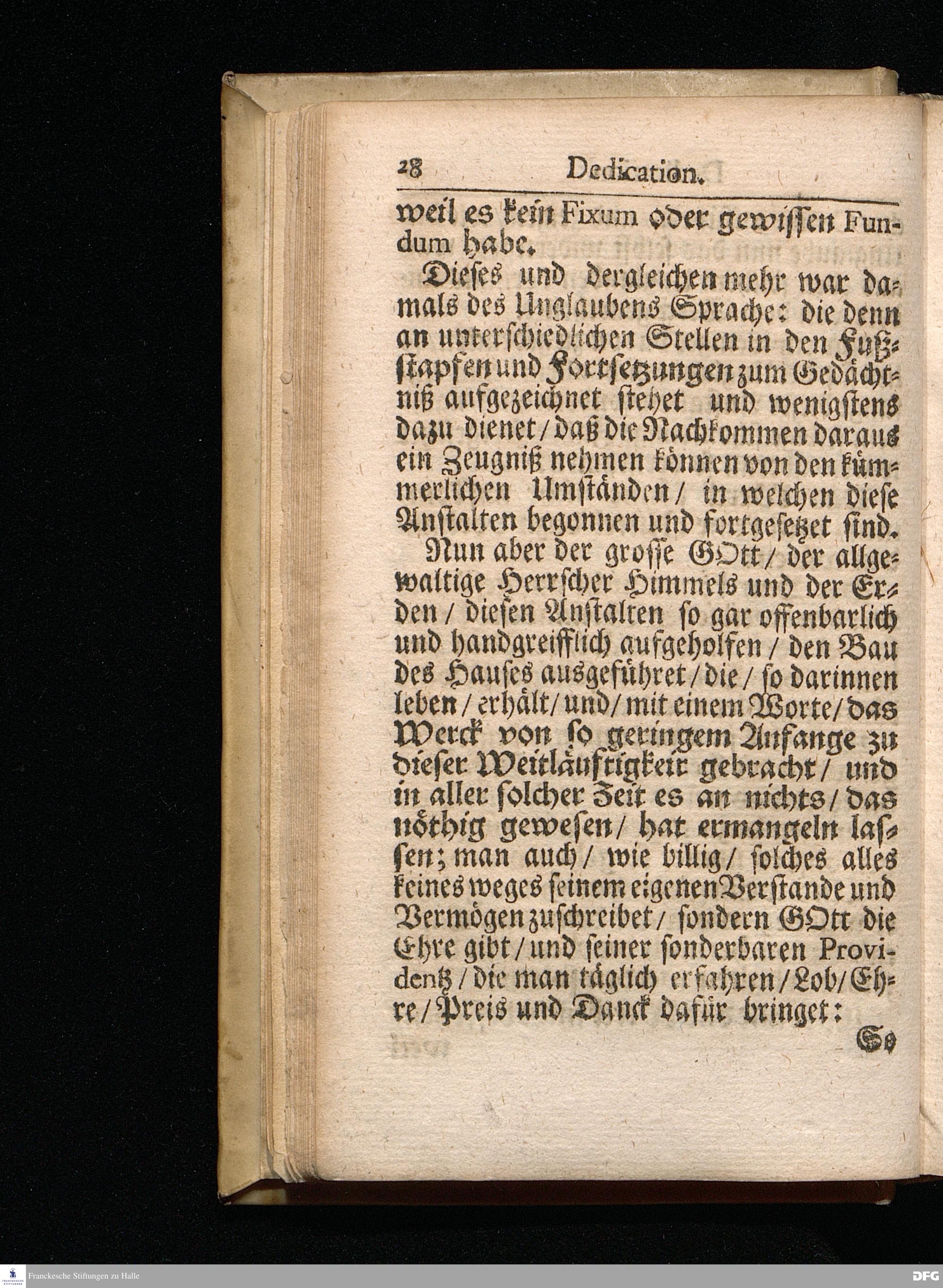 Segens=volle Fußstapfen des noch lebenden und waltenden liebreichen und getreuen GOttes / Zur Beschämung des Unglaubens und Stärckung des Glaubens entdecket durch eine wahrhafte und umständliche Nachricht von dem Wäysen=Hause und übrigen Anstalten zu Glaucha vor Halle: Welche im Jahr 1701. zum Druck befördert; ietzo aber zum dritten mal ediret / und bis auf gegenwärtiges Jahr fortgesetzet von August Herm.Francken / S.Theol.Prof.und Past. Halle / in Verlegung des Wäysen=hauses / MDCCIX.