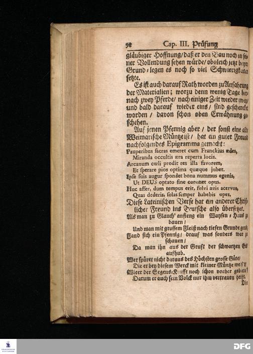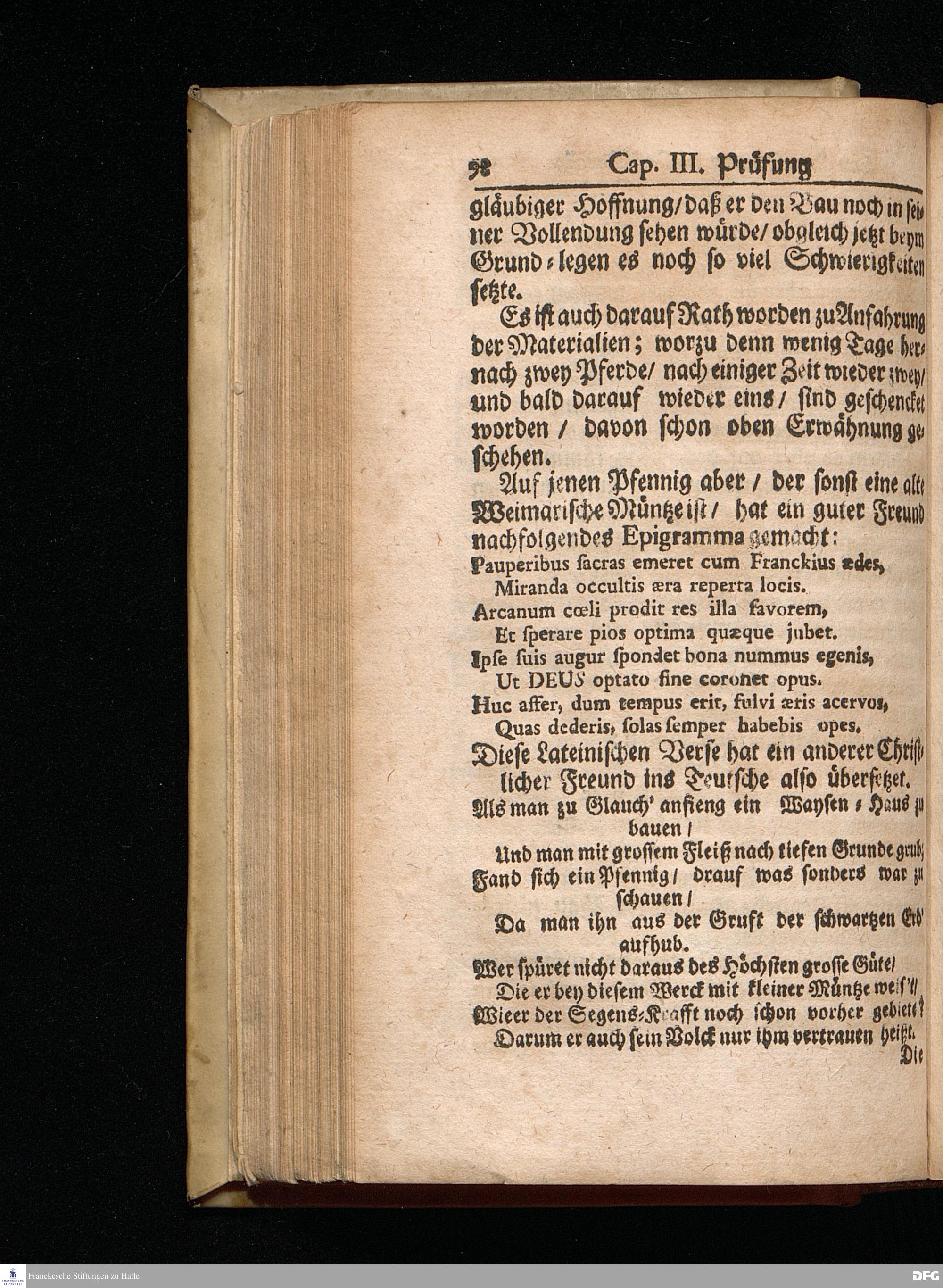 Segens=volle Fußstapfen des noch lebenden und waltenden liebreichen und getreuen GOttes / Zur Beschämung des Unglaubens und Stärckung des Glaubens entdecket durch eine wahrhafte und umständliche Nachricht von dem Wäysen=Hause und übrigen Anstalten zu Glaucha vor Halle: Welche im Jahr 1701. zum Druck befördert; ietzo aber zum dritten mal ediret / und bis auf gegenwärtiges Jahr fortgesetzet von August Herm.Francken / S.Theol.Prof.und Past. Halle / in Verlegung des Wäysen=hauses / MDCCIX.