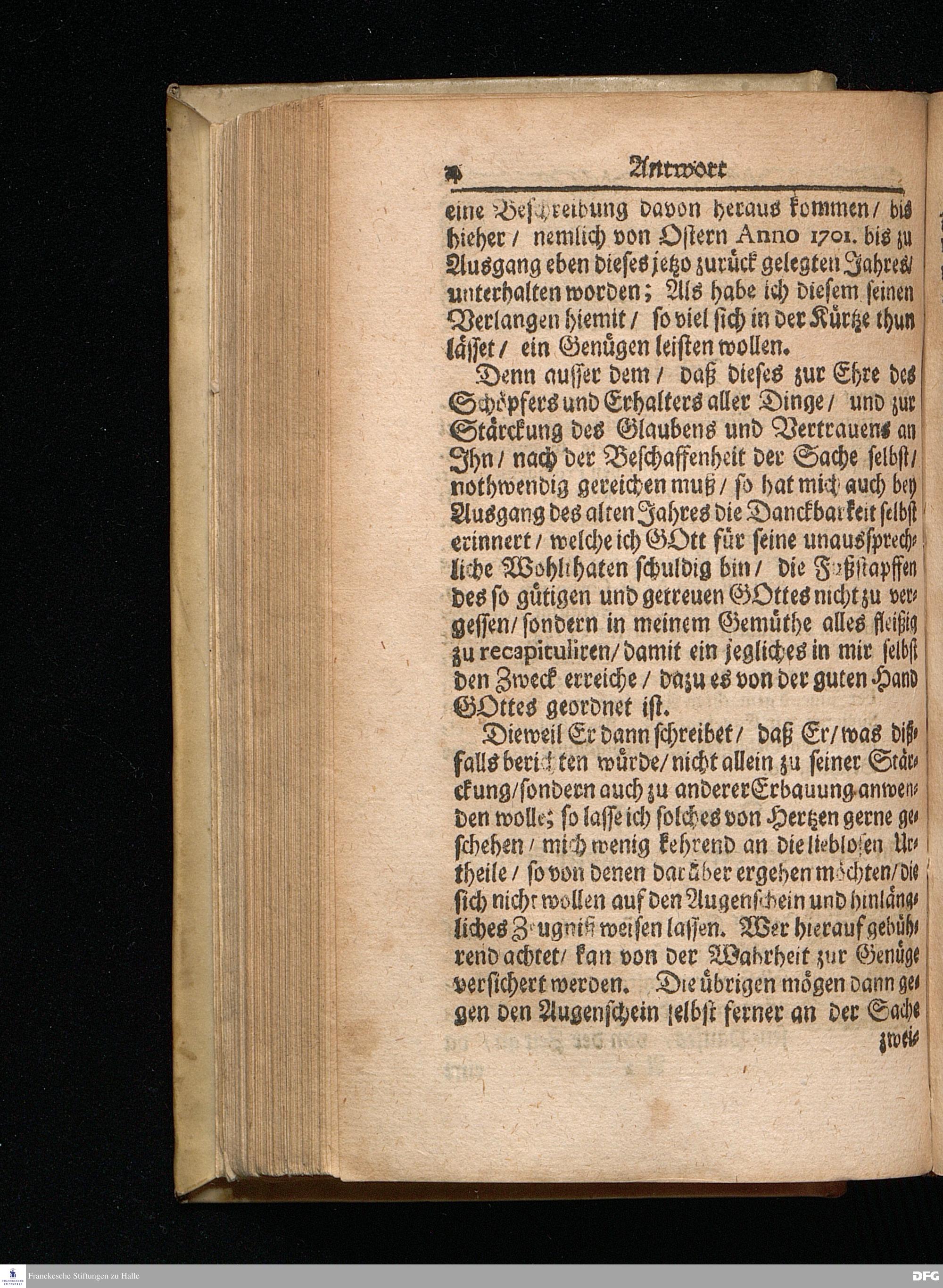 Segens=volle Fußstapfen des noch lebenden und waltenden liebreichen und getreuen GOttes / Zur Beschämung des Unglaubens und Stärckung des Glaubens entdecket durch eine wahrhafte und umständliche Nachricht von dem Wäysen=Hause und übrigen Anstalten zu Glaucha vor Halle: Welche im Jahr 1701. zum Druck befördert; ietzo aber zum dritten mal ediret / und bis auf gegenwärtiges Jahr fortgesetzet von August Herm.Francken / S.Theol.Prof.und Past. Halle / in Verlegung des Wäysen=hauses / MDCCIX.