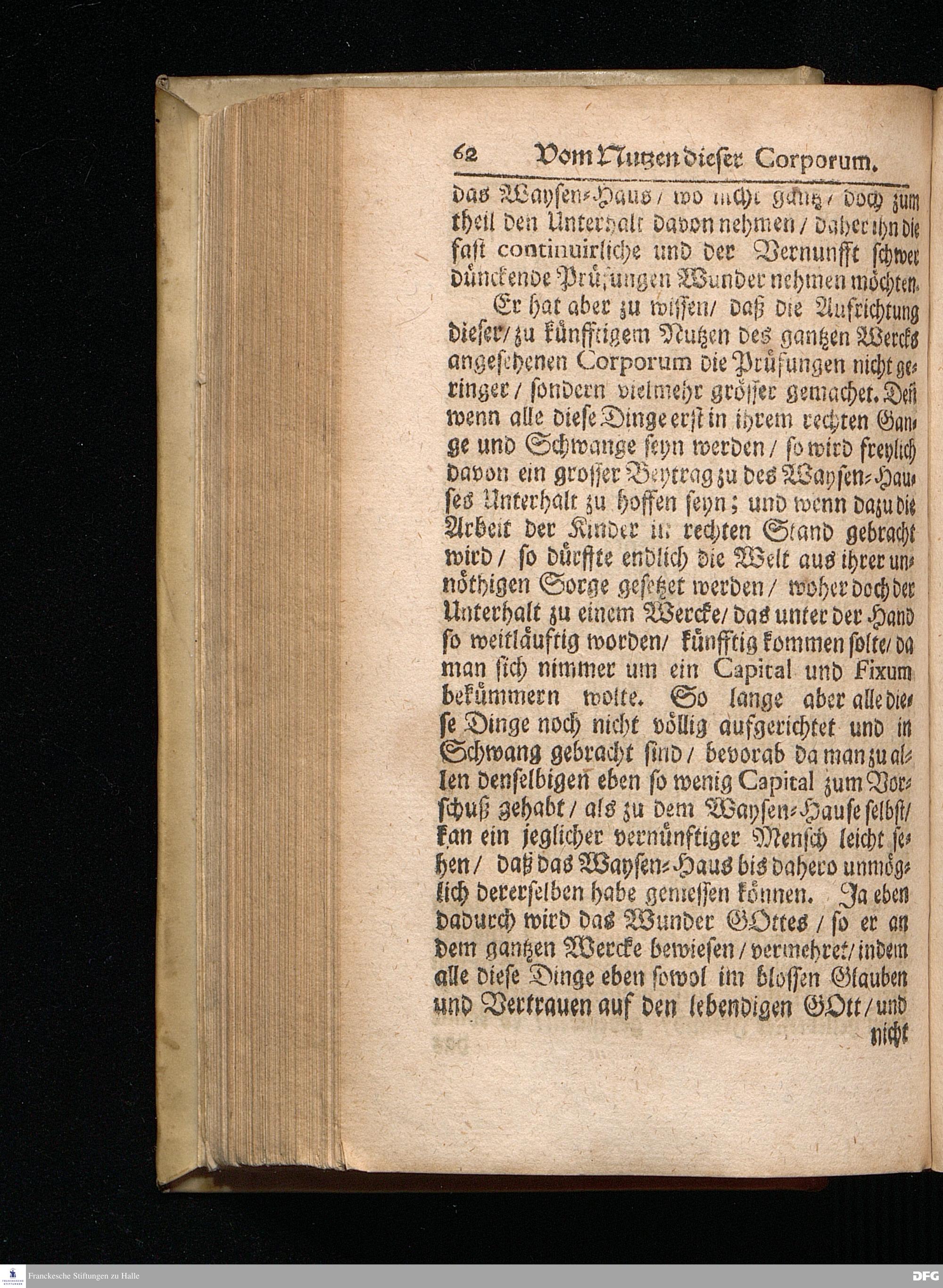 Segens=volle Fußstapfen des noch lebenden und waltenden liebreichen und getreuen GOttes / Zur Beschämung des Unglaubens und Stärckung des Glaubens entdecket durch eine wahrhafte und umständliche Nachricht von dem Wäysen=Hause und übrigen Anstalten zu Glaucha vor Halle: Welche im Jahr 1701. zum Druck befördert; ietzo aber zum dritten mal ediret / und bis auf gegenwärtiges Jahr fortgesetzet von August Herm.Francken / S.Theol.Prof.und Past. Halle / in Verlegung des Wäysen=hauses / MDCCIX.