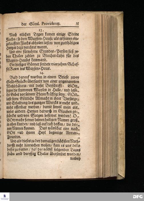 Segens=volle Fußstapfen des noch lebenden und waltenden liebreichen und getreuen GOttes / Zur Beschämung des Unglaubens und Stärckung des Glaubens entdecket durch eine wahrhafte und umständliche Nachricht von dem Wäysen=Hause und übrigen Anstalten zu Glaucha vor Halle: Welche im Jahr 1701. zum Druck befördert; ietzo aber zum dritten mal ediret / und bis auf gegenwärtiges Jahr fortgesetzet von August Herm.Francken / S.Theol.Prof.und Past. Halle / in Verlegung des Wäysen=hauses / MDCCIX.