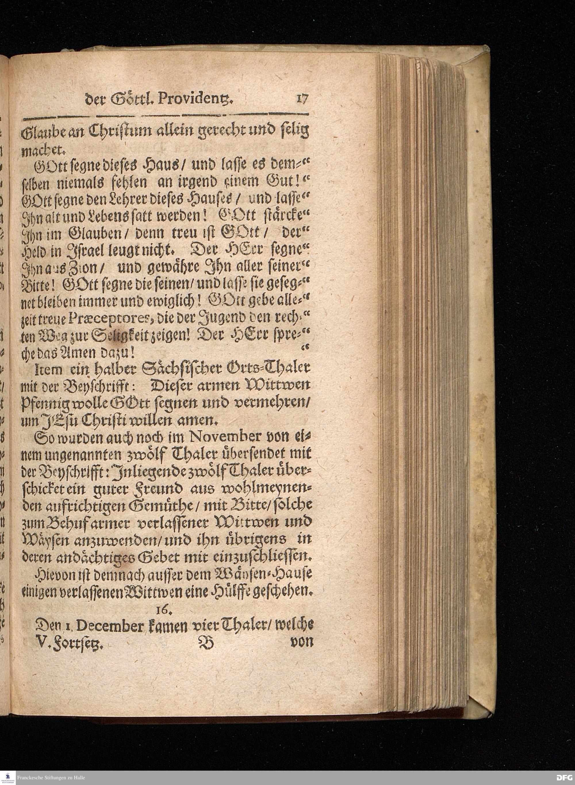 Segens=volle Fußstapfen des noch lebenden und waltenden liebreichen und getreuen GOttes / Zur Beschämung des Unglaubens und Stärckung des Glaubens entdecket durch eine wahrhafte und umständliche Nachricht von dem Wäysen=Hause und übrigen Anstalten zu Glaucha vor Halle: Welche im Jahr 1701. zum Druck befördert; ietzo aber zum dritten mal ediret / und bis auf gegenwärtiges Jahr fortgesetzet von August Herm.Francken / S.Theol.Prof.und Past. Halle / in Verlegung des Wäysen=hauses / MDCCIX.