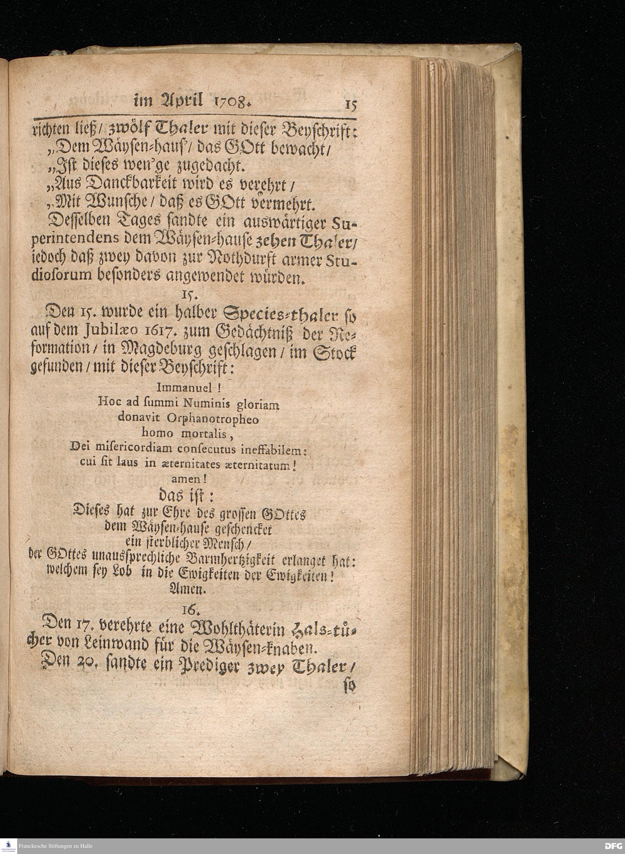 Segens=volle Fußstapfen des noch lebenden und waltenden liebreichen und getreuen GOttes / Zur Beschämung des Unglaubens und Stärckung des Glaubens entdecket durch eine wahrhafte und umständliche Nachricht von dem Wäysen=Hause und übrigen Anstalten zu Glaucha vor Halle: Welche im Jahr 1701. zum Druck befördert; ietzo aber zum dritten mal ediret / und bis auf gegenwärtiges Jahr fortgesetzet von August Herm.Francken / S.Theol.Prof.und Past. Halle / in Verlegung des Wäysen=hauses / MDCCIX.