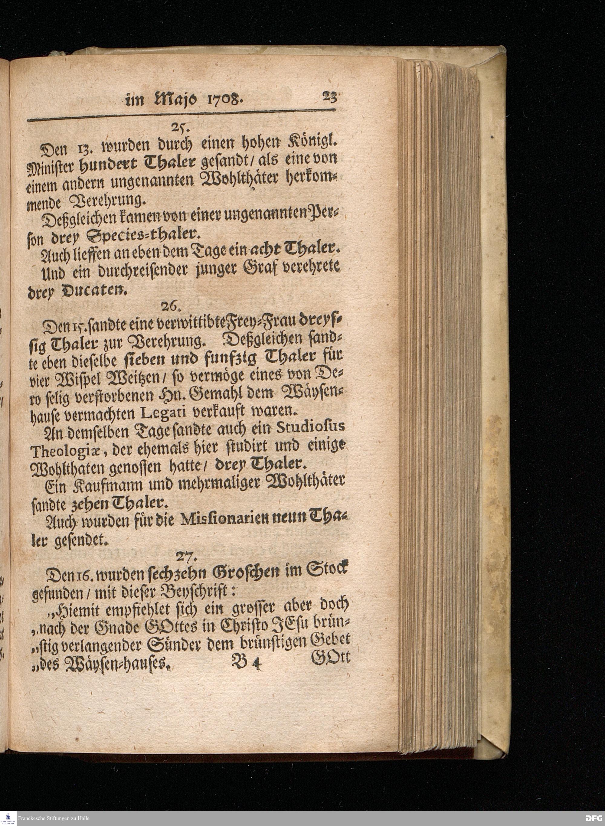Segens=volle Fußstapfen des noch lebenden und waltenden liebreichen und getreuen GOttes / Zur Beschämung des Unglaubens und Stärckung des Glaubens entdecket durch eine wahrhafte und umständliche Nachricht von dem Wäysen=Hause und übrigen Anstalten zu Glaucha vor Halle: Welche im Jahr 1701. zum Druck befördert; ietzo aber zum dritten mal ediret / und bis auf gegenwärtiges Jahr fortgesetzet von August Herm.Francken / S.Theol.Prof.und Past. Halle / in Verlegung des Wäysen=hauses / MDCCIX.