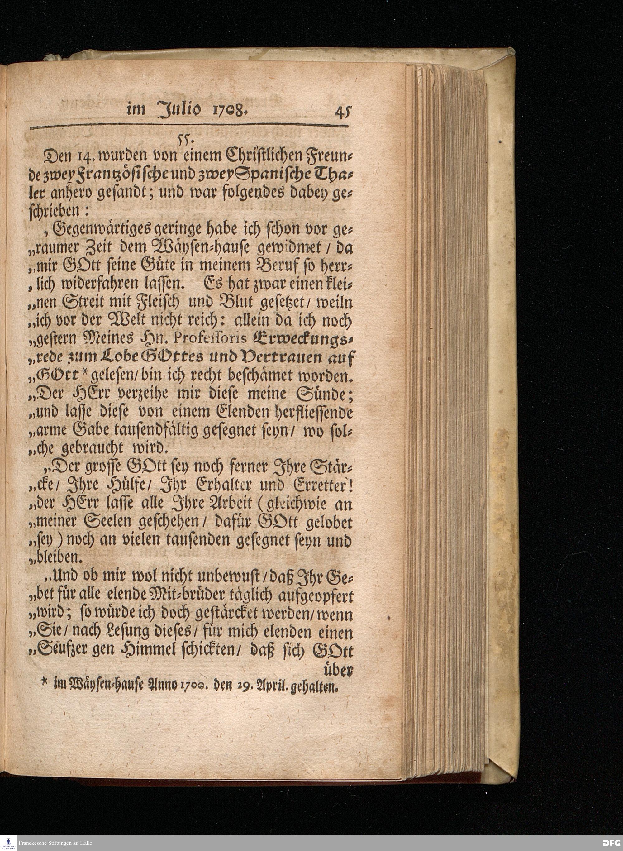 Segens=volle Fußstapfen des noch lebenden und waltenden liebreichen und getreuen GOttes / Zur Beschämung des Unglaubens und Stärckung des Glaubens entdecket durch eine wahrhafte und umständliche Nachricht von dem Wäysen=Hause und übrigen Anstalten zu Glaucha vor Halle: Welche im Jahr 1701. zum Druck befördert; ietzo aber zum dritten mal ediret / und bis auf gegenwärtiges Jahr fortgesetzet von August Herm.Francken / S.Theol.Prof.und Past. Halle / in Verlegung des Wäysen=hauses / MDCCIX.