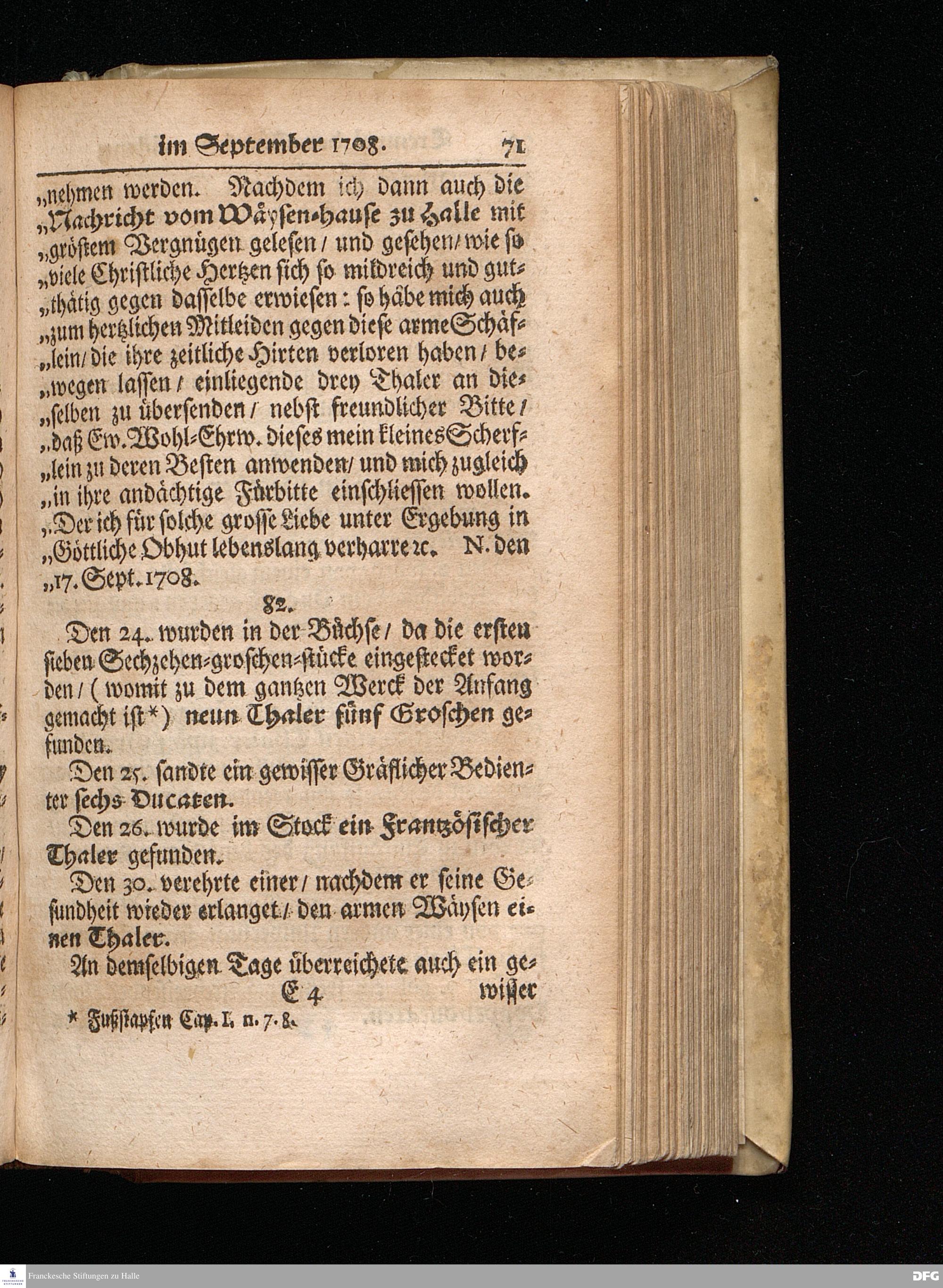 Segens=volle Fußstapfen des noch lebenden und waltenden liebreichen und getreuen GOttes / Zur Beschämung des Unglaubens und Stärckung des Glaubens entdecket durch eine wahrhafte und umständliche Nachricht von dem Wäysen=Hause und übrigen Anstalten zu Glaucha vor Halle: Welche im Jahr 1701. zum Druck befördert; ietzo aber zum dritten mal ediret / und bis auf gegenwärtiges Jahr fortgesetzet von August Herm.Francken / S.Theol.Prof.und Past. Halle / in Verlegung des Wäysen=hauses / MDCCIX.