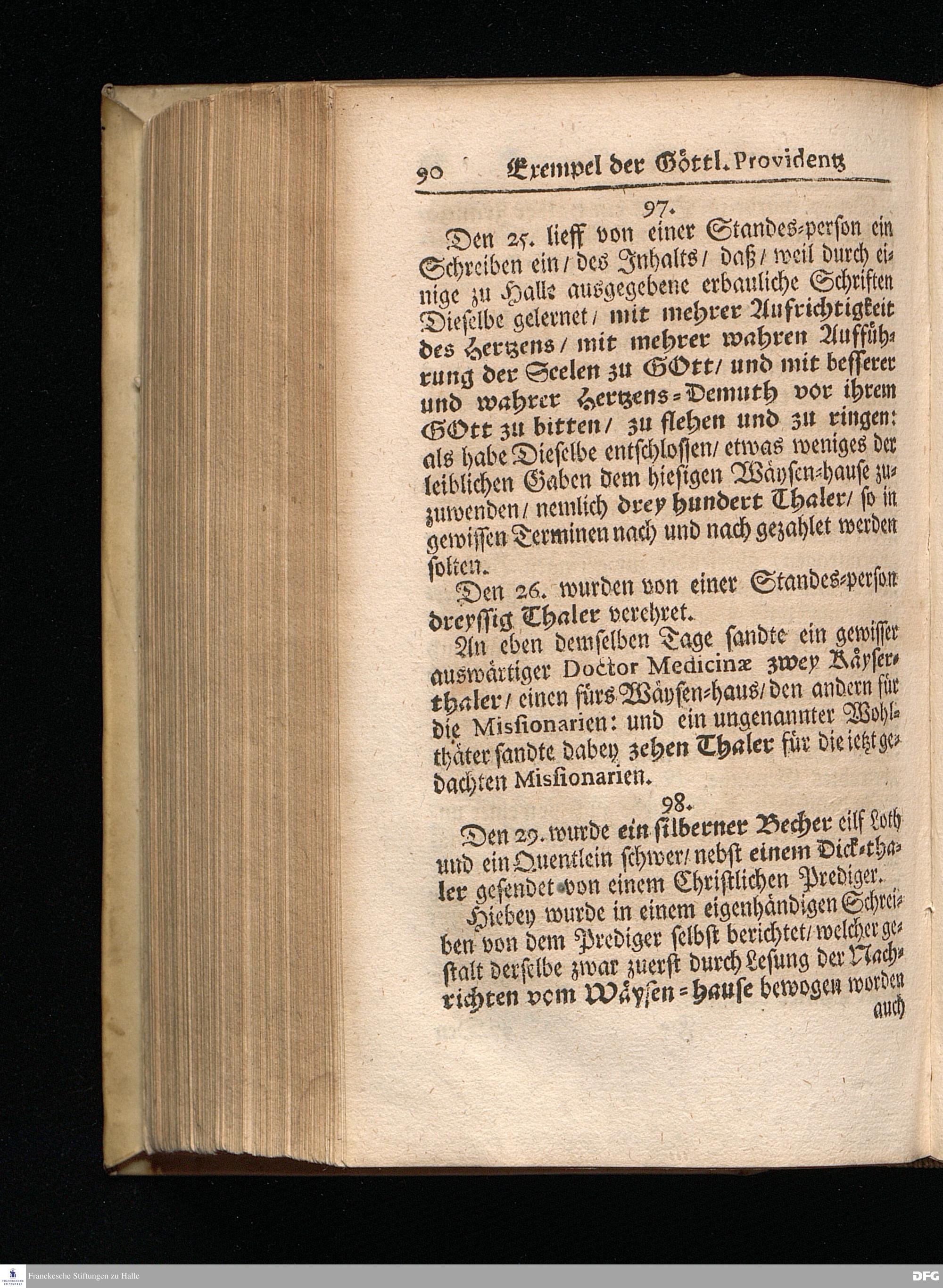 Segens=volle Fußstapfen des noch lebenden und waltenden liebreichen und getreuen GOttes / Zur Beschämung des Unglaubens und Stärckung des Glaubens entdecket durch eine wahrhafte und umständliche Nachricht von dem Wäysen=Hause und übrigen Anstalten zu Glaucha vor Halle: Welche im Jahr 1701. zum Druck befördert; ietzo aber zum dritten mal ediret / und bis auf gegenwärtiges Jahr fortgesetzet von August Herm.Francken / S.Theol.Prof.und Past. Halle / in Verlegung des Wäysen=hauses / MDCCIX.