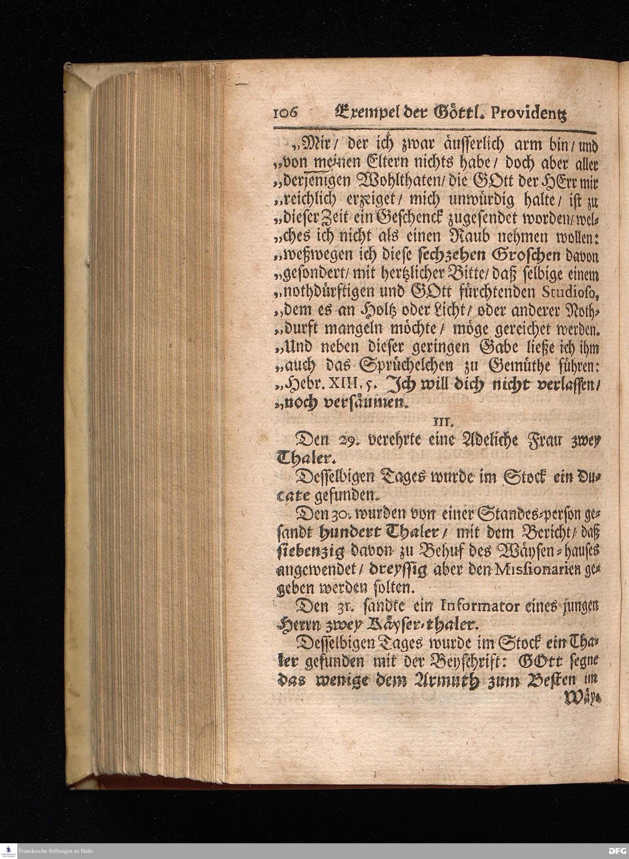 Segens=volle Fußstapfen des noch lebenden und waltenden liebreichen und getreuen GOttes / Zur Beschämung des Unglaubens und Stärckung des Glaubens entdecket durch eine wahrhafte und umständliche Nachricht von dem Wäysen=Hause und übrigen Anstalten zu Glaucha vor Halle: Welche im Jahr 1701. zum Druck befördert; ietzo aber zum dritten mal ediret / und bis auf gegenwärtiges Jahr fortgesetzet von August Herm.Francken / S.Theol.Prof.und Past. Halle / in Verlegung des Wäysen=hauses / MDCCIX.