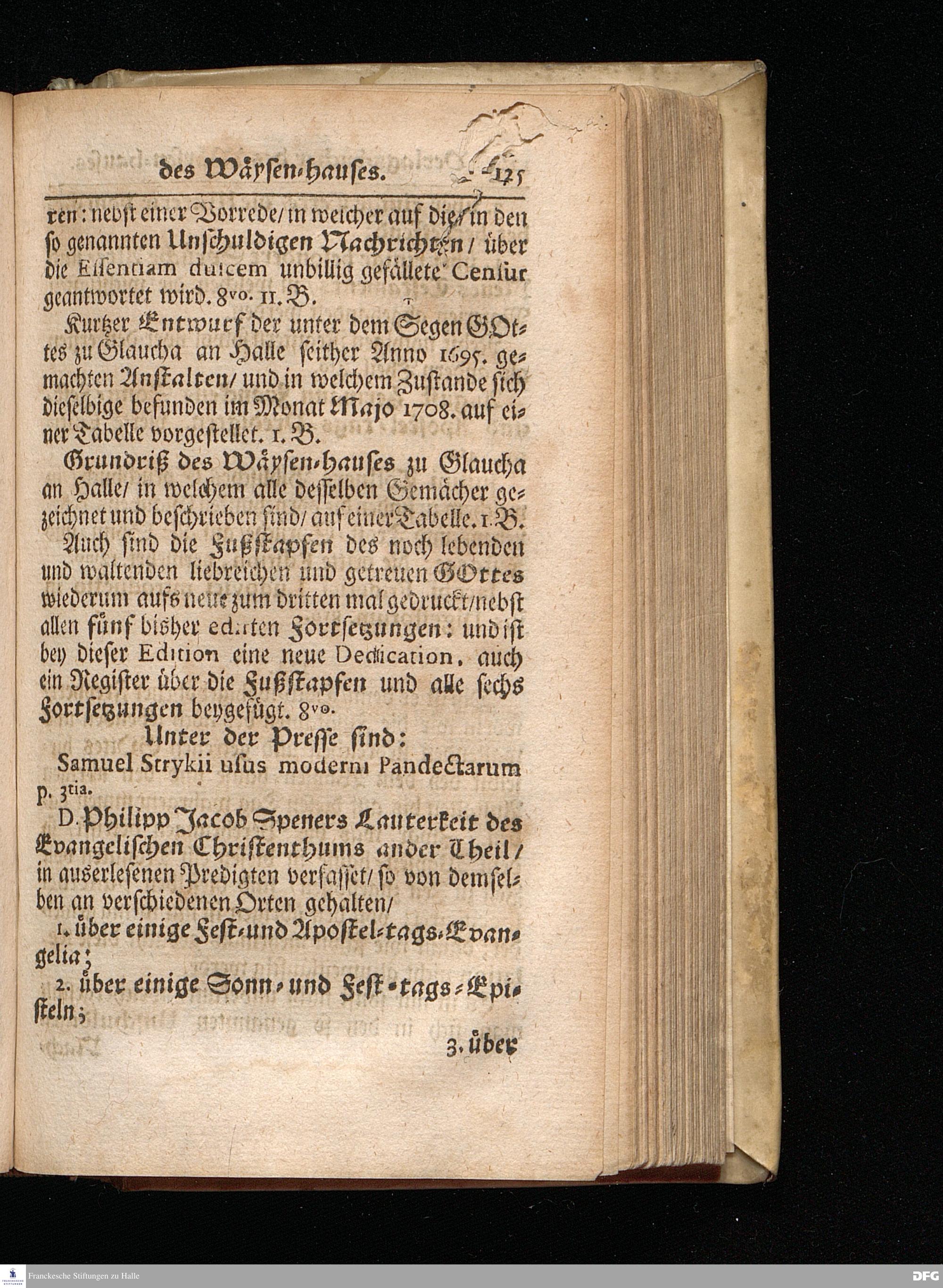 Segens=volle Fußstapfen des noch lebenden und waltenden liebreichen und getreuen GOttes / Zur Beschämung des Unglaubens und Stärckung des Glaubens entdecket durch eine wahrhafte und umständliche Nachricht von dem Wäysen=Hause und übrigen Anstalten zu Glaucha vor Halle: Welche im Jahr 1701. zum Druck befördert; ietzo aber zum dritten mal ediret / und bis auf gegenwärtiges Jahr fortgesetzet von August Herm.Francken / S.Theol.Prof.und Past. Halle / in Verlegung des Wäysen=hauses / MDCCIX.