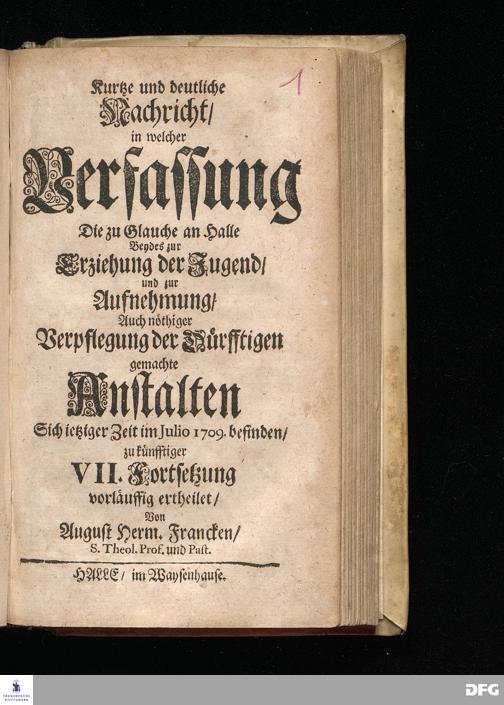 Segens=volle Fußstapfen des noch lebenden und waltenden liebreichen und getreuen GOttes / Zur Beschämung des Unglaubens und Stärckung des Glaubens entdecket durch eine wahrhafte und umständliche Nachricht von dem Wäysen=Hause und übrigen Anstalten zu Glaucha vor Halle: Welche im Jahr 1701. zum Druck befördert; ietzo aber zum dritten mal ediret / und bis auf gegenwärtiges Jahr fortgesetzet von August Herm.Francken / S.Theol.Prof.und Past. Halle / in Verlegung des Wäysen=hauses / MDCCIX.