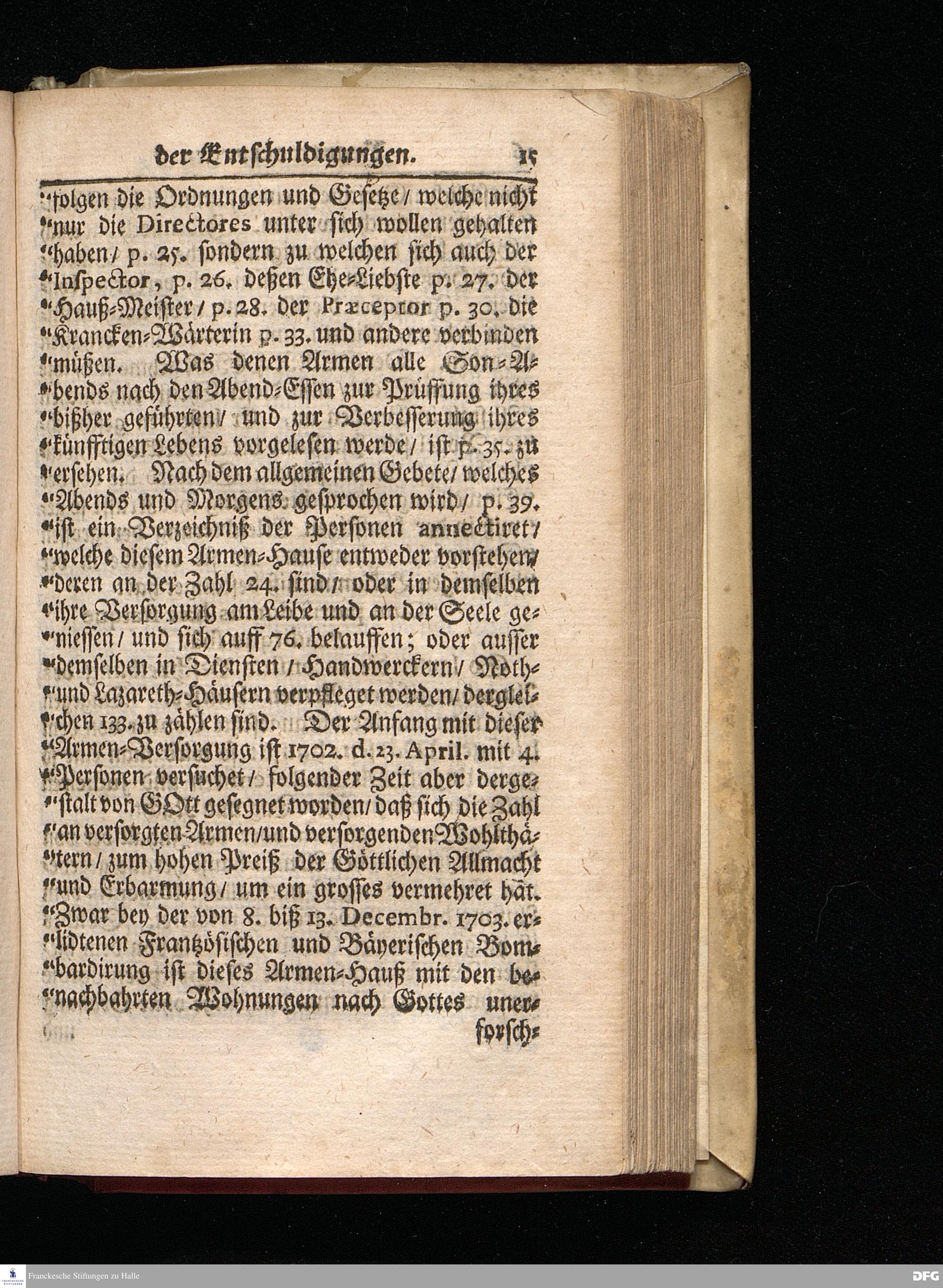 Segens=volle Fußstapfen des noch lebenden und waltenden liebreichen und getreuen GOttes / Zur Beschämung des Unglaubens und Stärckung des Glaubens entdecket durch eine wahrhafte und umständliche Nachricht von dem Wäysen=Hause und übrigen Anstalten zu Glaucha vor Halle: Welche im Jahr 1701. zum Druck befördert; ietzo aber zum dritten mal ediret / und bis auf gegenwärtiges Jahr fortgesetzet von August Herm.Francken / S.Theol.Prof.und Past. Halle / in Verlegung des Wäysen=hauses / MDCCIX.