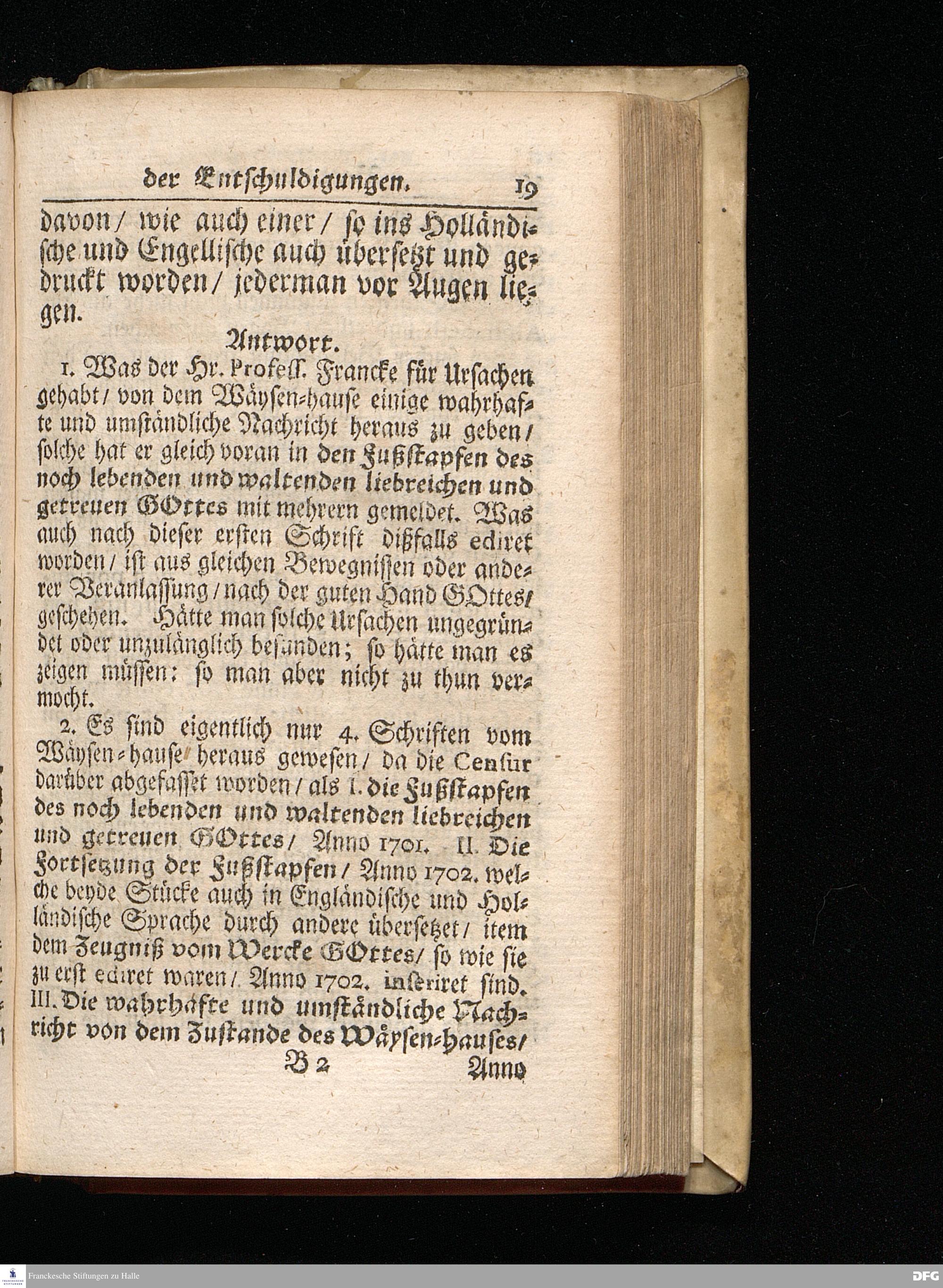 Segens=volle Fußstapfen des noch lebenden und waltenden liebreichen und getreuen GOttes / Zur Beschämung des Unglaubens und Stärckung des Glaubens entdecket durch eine wahrhafte und umständliche Nachricht von dem Wäysen=Hause und übrigen Anstalten zu Glaucha vor Halle: Welche im Jahr 1701. zum Druck befördert; ietzo aber zum dritten mal ediret / und bis auf gegenwärtiges Jahr fortgesetzet von August Herm.Francken / S.Theol.Prof.und Past. Halle / in Verlegung des Wäysen=hauses / MDCCIX.