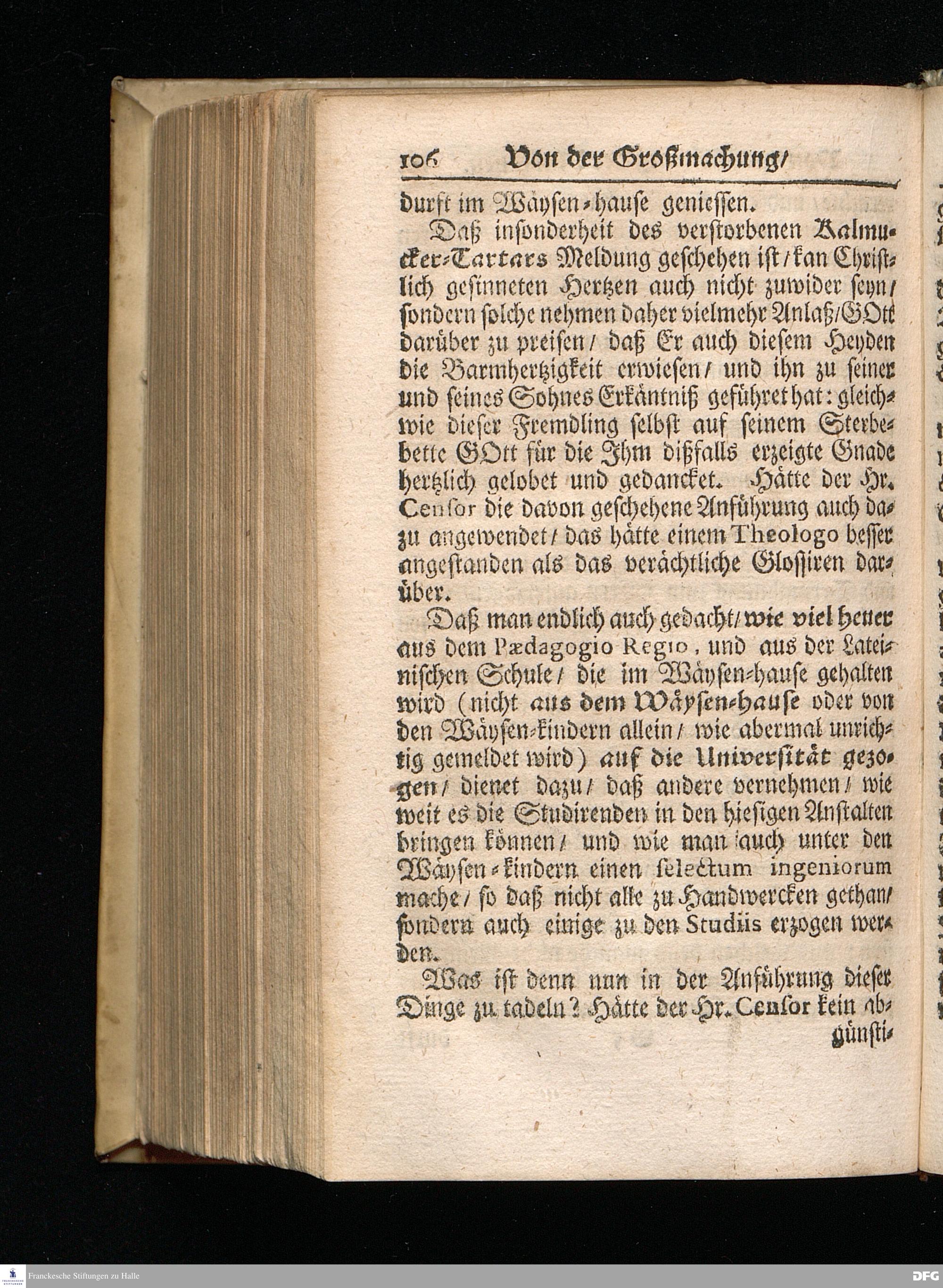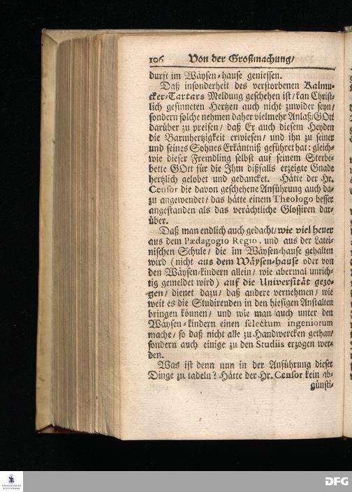 Segens=volle Fußstapfen des noch lebenden und waltenden liebreichen und getreuen GOttes / Zur Beschämung des Unglaubens und Stärckung des Glaubens entdecket durch eine wahrhafte und umständliche Nachricht von dem Wäysen=Hause und übrigen Anstalten zu Glaucha vor Halle: Welche im Jahr 1701. zum Druck befördert; ietzo aber zum dritten mal ediret / und bis auf gegenwärtiges Jahr fortgesetzet von August Herm.Francken / S.Theol.Prof.und Past. Halle / in Verlegung des Wäysen=hauses / MDCCIX.