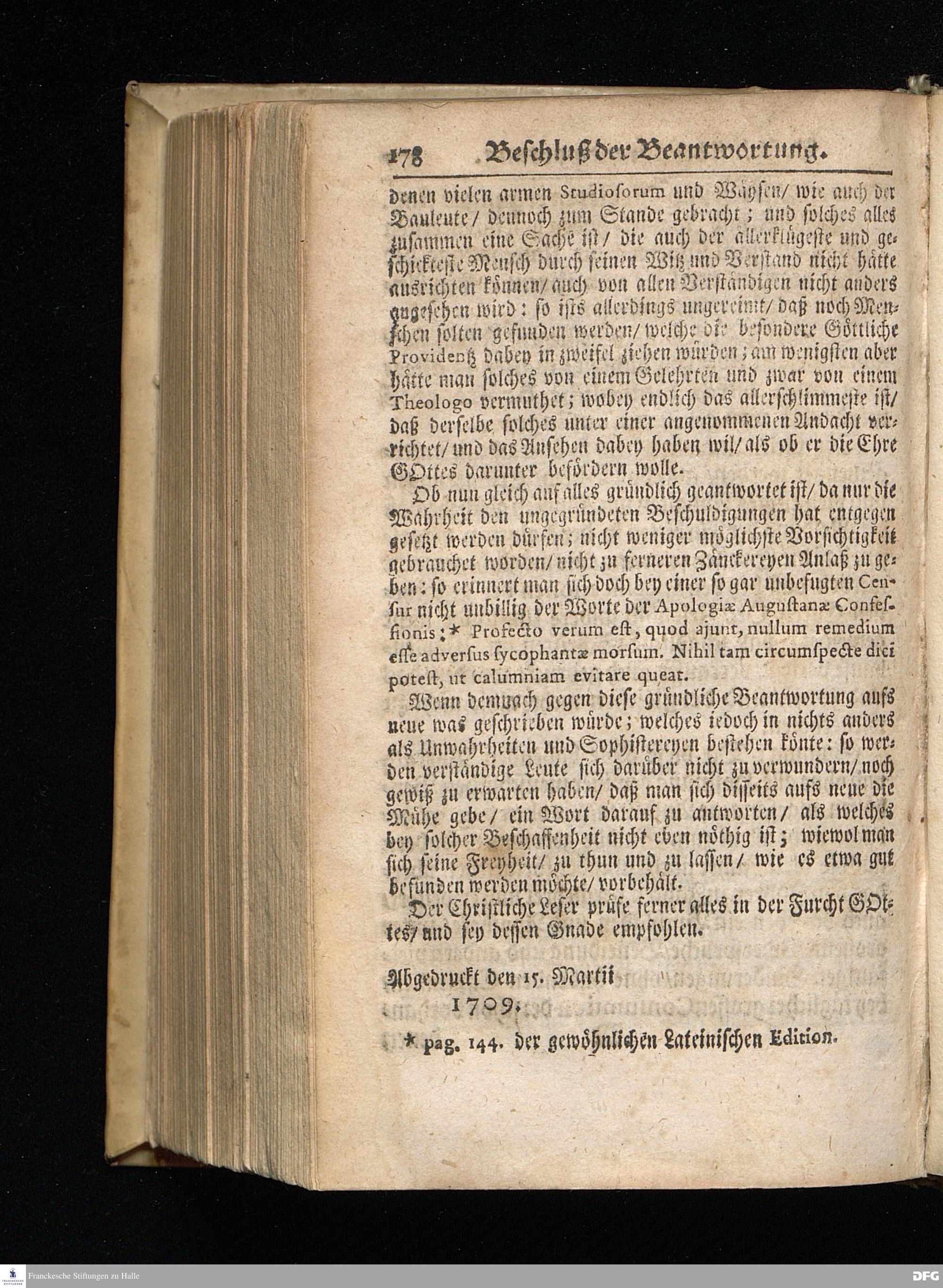 Segens=volle Fußstapfen des noch lebenden und waltenden liebreichen und getreuen GOttes / Zur Beschämung des Unglaubens und Stärckung des Glaubens entdecket durch eine wahrhafte und umständliche Nachricht von dem Wäysen=Hause und übrigen Anstalten zu Glaucha vor Halle: Welche im Jahr 1701. zum Druck befördert; ietzo aber zum dritten mal ediret / und bis auf gegenwärtiges Jahr fortgesetzet von August Herm.Francken / S.Theol.Prof.und Past. Halle / in Verlegung des Wäysen=hauses / MDCCIX.