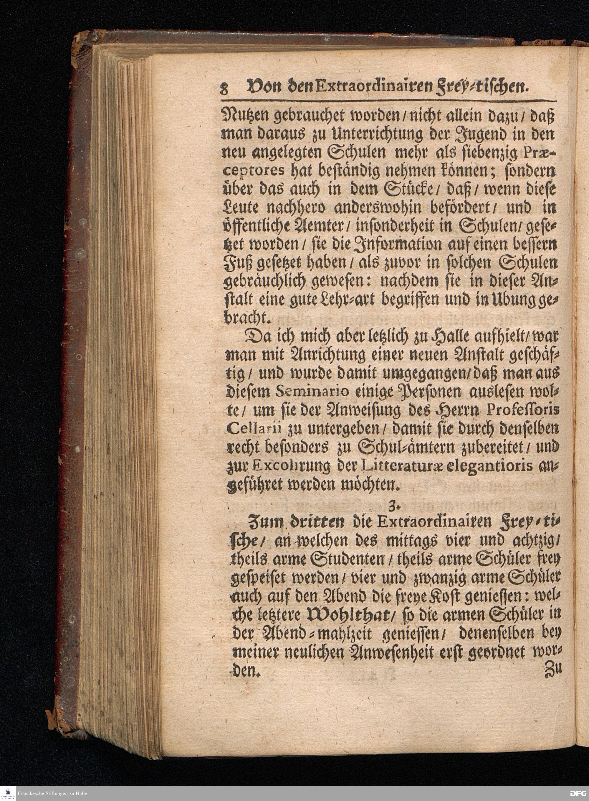 Segens=volle Fußstapfen des noch lebenden und waltenden liebreichen und getreuen GOttes / Zur Beschämung des Unglaubens und Stärckung des Glaubens entdecket durch eine wahrhafte und umständliche Nachricht von dem Wäysen=Hause und übrigen Anstalten zu Glaucha vor Halle: Welche im Jahr 1701. zum Druck befördert; ietzo aber zum dritten mal ediret / und bis auf gegenwärtiges Jahr fortgesetzet von August.Herm.Francken / S.Theol.Prof.und Past. Halle / in Verlegung des Wäysen=hauses / MDCCIX.