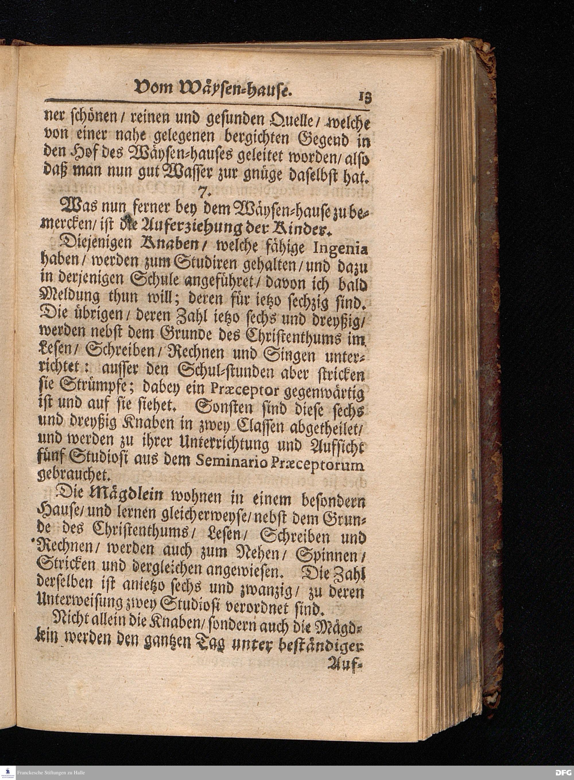 Segens=volle Fußstapfen des noch lebenden und waltenden liebreichen und getreuen GOttes / Zur Beschämung des Unglaubens und Stärckung des Glaubens entdecket durch eine wahrhafte und umständliche Nachricht von dem Wäysen=Hause und übrigen Anstalten zu Glaucha vor Halle: Welche im Jahr 1701. zum Druck befördert; ietzo aber zum dritten mal ediret / und bis auf gegenwärtiges Jahr fortgesetzet von August.Herm.Francken / S.Theol.Prof.und Past. Halle / in Verlegung des Wäysen=hauses / MDCCIX.