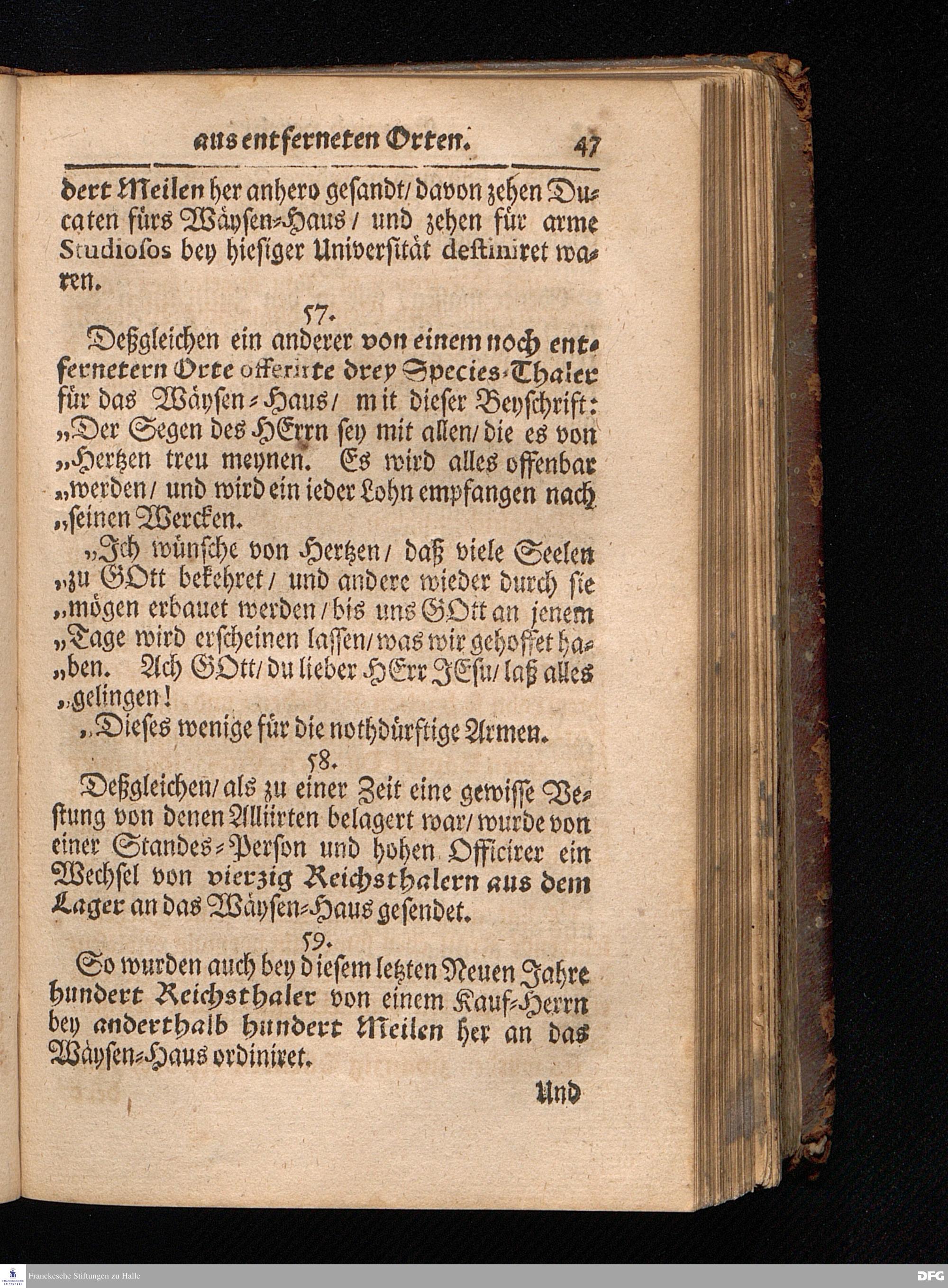 Segens=volle Fußstapfen des noch lebenden und waltenden liebreichen und getreuen GOttes / Zur Beschämung des Unglaubens und Stärckung des Glaubens entdecket durch eine wahrhafte und umständliche Nachricht von dem Wäysen=Hause und übrigen Anstalten zu Glaucha vor Halle: Welche im Jahr 1701. zum Druck befördert; ietzo aber zum dritten mal ediret / und bis auf gegenwärtiges Jahr fortgesetzet von August.Herm.Francken / S.Theol.Prof.und Past. Halle / in Verlegung des Wäysen=hauses / MDCCIX.