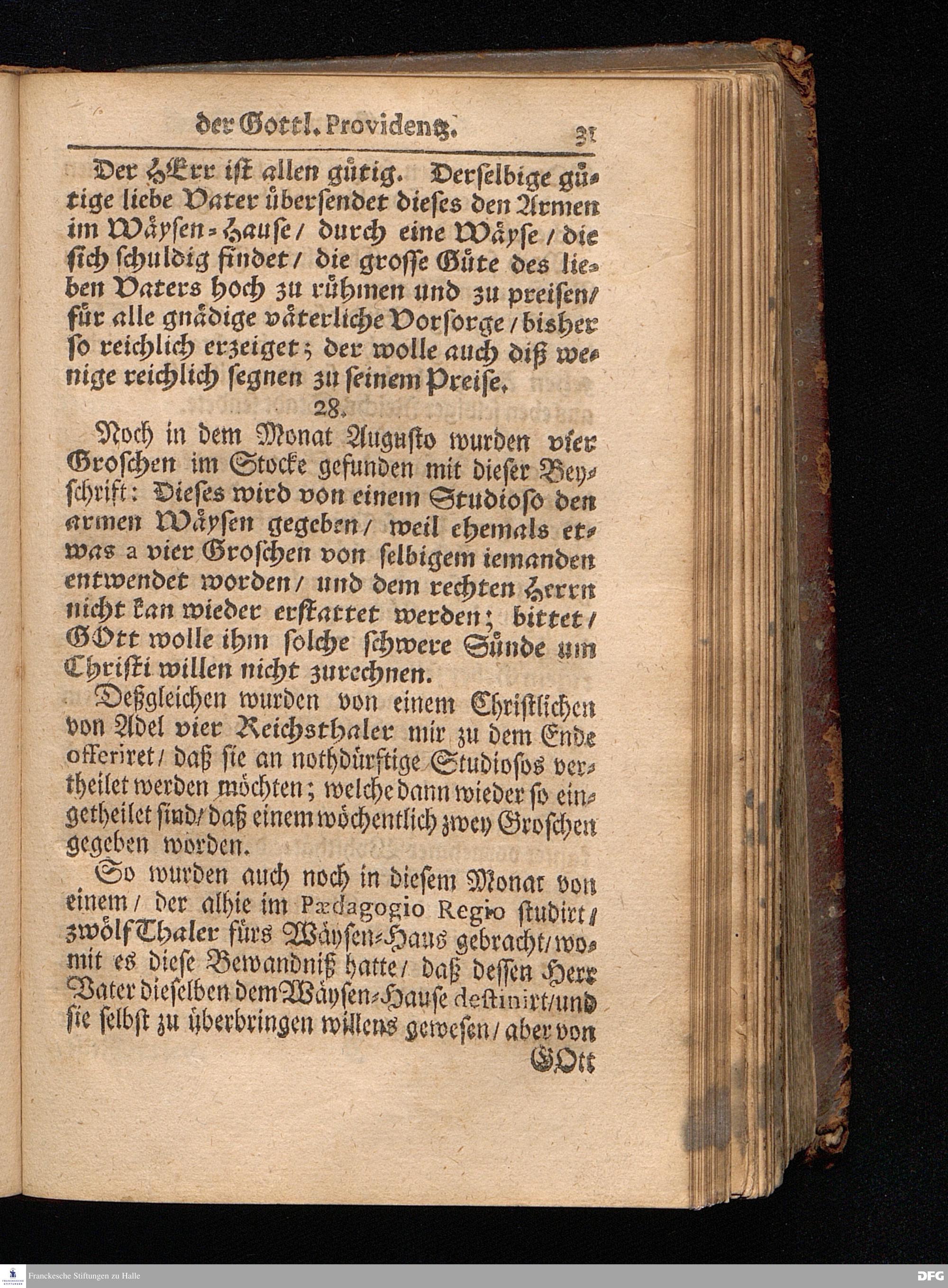 Segens=volle Fußstapfen des noch lebenden und waltenden liebreichen und getreuen GOttes / Zur Beschämung des Unglaubens und Stärckung des Glaubens entdecket durch eine wahrhafte und umständliche Nachricht von dem Wäysen=Hause und übrigen Anstalten zu Glaucha vor Halle: Welche im Jahr 1701. zum Druck befördert; ietzo aber zum dritten mal ediret / und bis auf gegenwärtiges Jahr fortgesetzet von August.Herm.Francken / S.Theol.Prof.und Past. Halle / in Verlegung des Wäysen=hauses / MDCCIX.