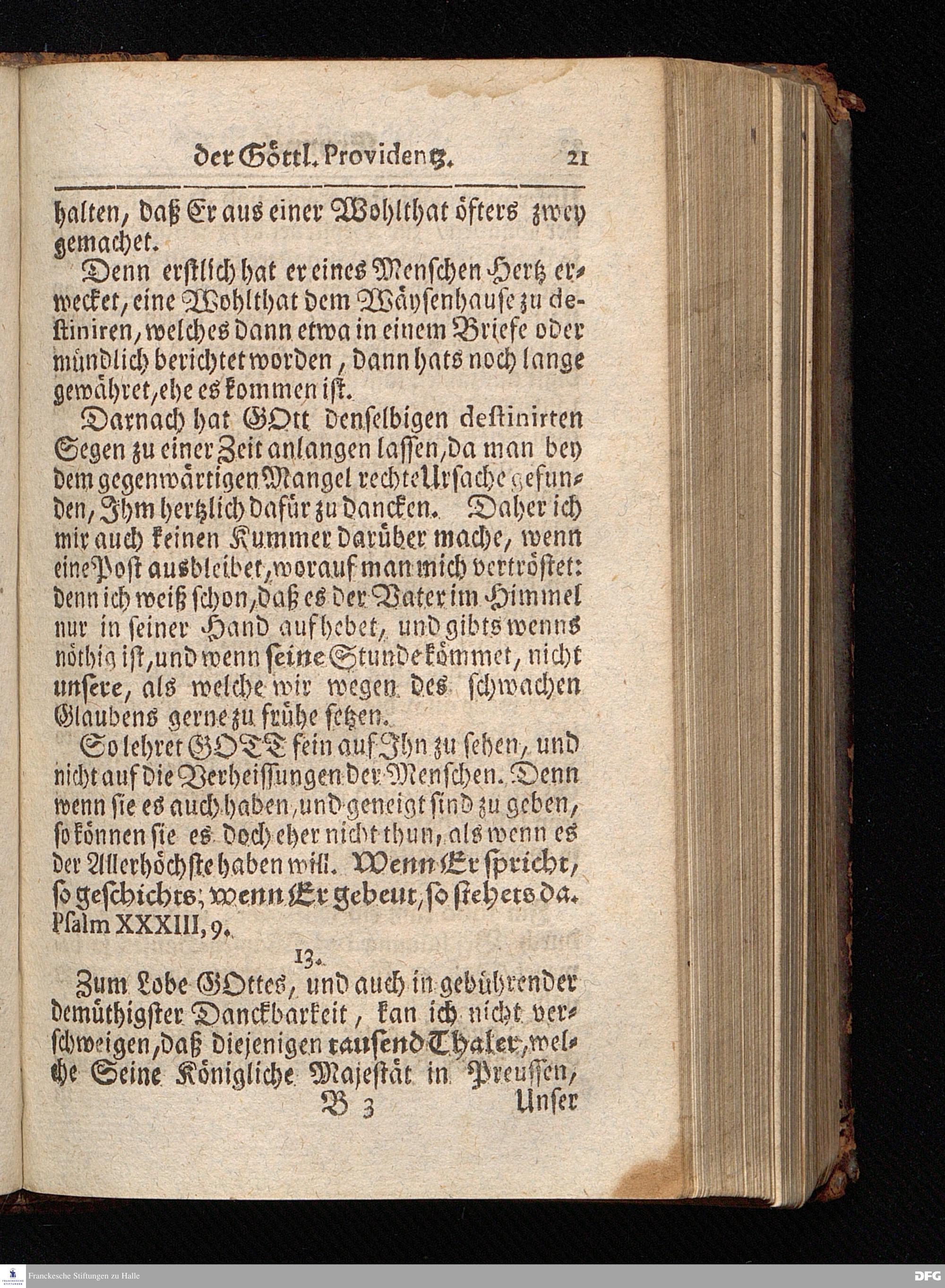 Segens=volle Fußstapfen des noch lebenden und waltenden liebrei=│chen und getreuen GOttes, Zur Beschämung des Unglaubens und Stärckung des Glaubens, entdecket durch eine wahrhafte und umständliche Nachricht von dem Wäysen=Hause und übrigen Anstalten zu Glaucha vor Halle; Welche Im Jahr 1701. zum Druck befördert, ietzo aber zum dritten mal ediret, und bis auf gegenwärtiges Jahr fortgesetzet von August Hermann Francken, S.Theol.Prof.und Past. HALLE, in Verlegung des Wäysen=Hauses, MDCCIX.