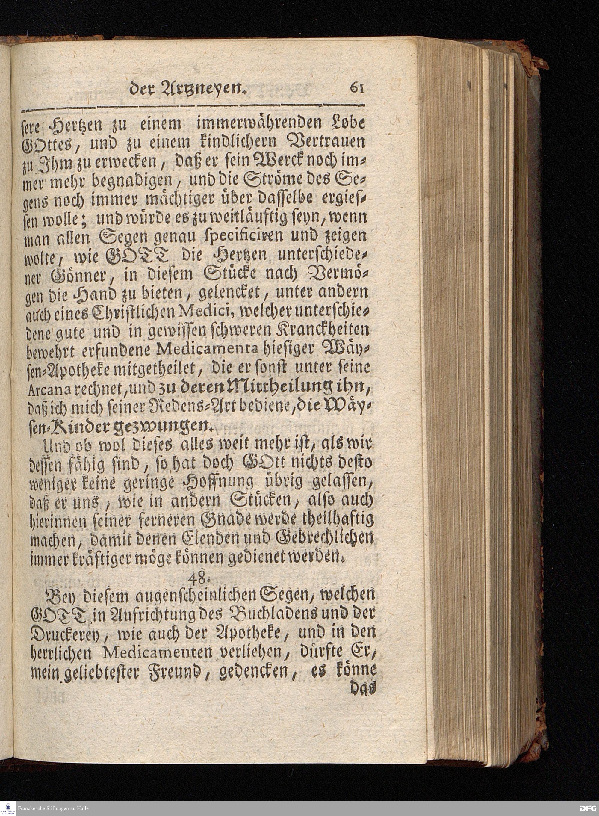 Segens=volle Fußstapfen des noch lebenden und waltenden liebrei=│chen und getreuen GOttes, Zur Beschämung des Unglaubens und Stärckung des Glaubens, entdecket durch eine wahrhafte und umständliche Nachricht von dem Wäysen=Hause und übrigen Anstalten zu Glaucha vor Halle; Welche Im Jahr 1701. zum Druck befördert, ietzo aber zum dritten mal ediret, und bis auf gegenwärtiges Jahr fortgesetzet von August Hermann Francken, S.Theol.Prof.und Past. HALLE, in Verlegung des Wäysen=Hauses, MDCCIX.