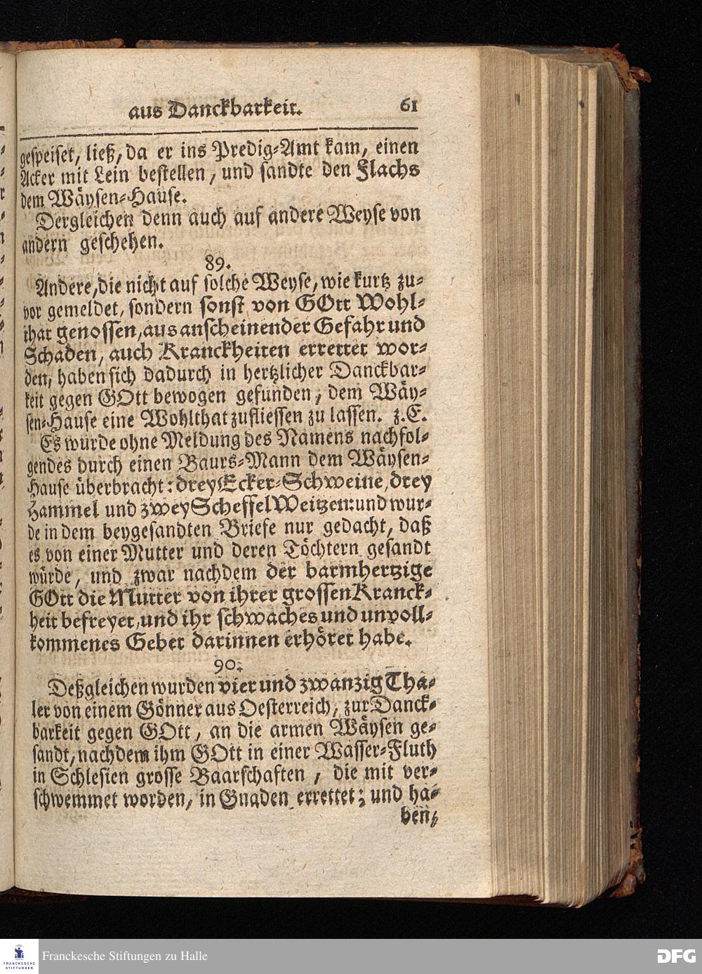 Segens=volle Fußstapfen des noch lebenden und waltenden liebrei=│chen und getreuen GOttes, Zur Beschämung des Unglaubens und Stärckung des Glaubens, entdecket durch eine wahrhafte und umständliche Nachricht von dem Wäysen=Hause und übrigen Anstalten zu Glaucha vor Halle; Welche Im Jahr 1701. zum Druck befördert, ietzo aber zum dritten mal ediret, und bis auf gegenwärtiges Jahr fortgesetzet von August Hermann Francken, S.Theol.Prof.und Past. HALLE, in Verlegung des Wäysen=Hauses, MDCCIX.