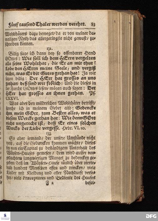 Segens=volle Fußstapfen des noch lebenden und waltenden liebrei=│chen und getreuen GOttes, Zur Beschämung des Unglaubens und Stärckung des Glaubens, entdecket durch eine wahrhafte und umständliche Nachricht von dem Wäysen=Hause und übrigen Anstalten zu Glaucha vor Halle; Welche Im Jahr 1701. zum Druck befördert, ietzo aber zum dritten mal ediret, und bis auf gegenwärtiges Jahr fortgesetzet von August Hermann Francken, S.Theol.Prof.und Past. HALLE, in Verlegung des Wäysen=Hauses, MDCCIX.