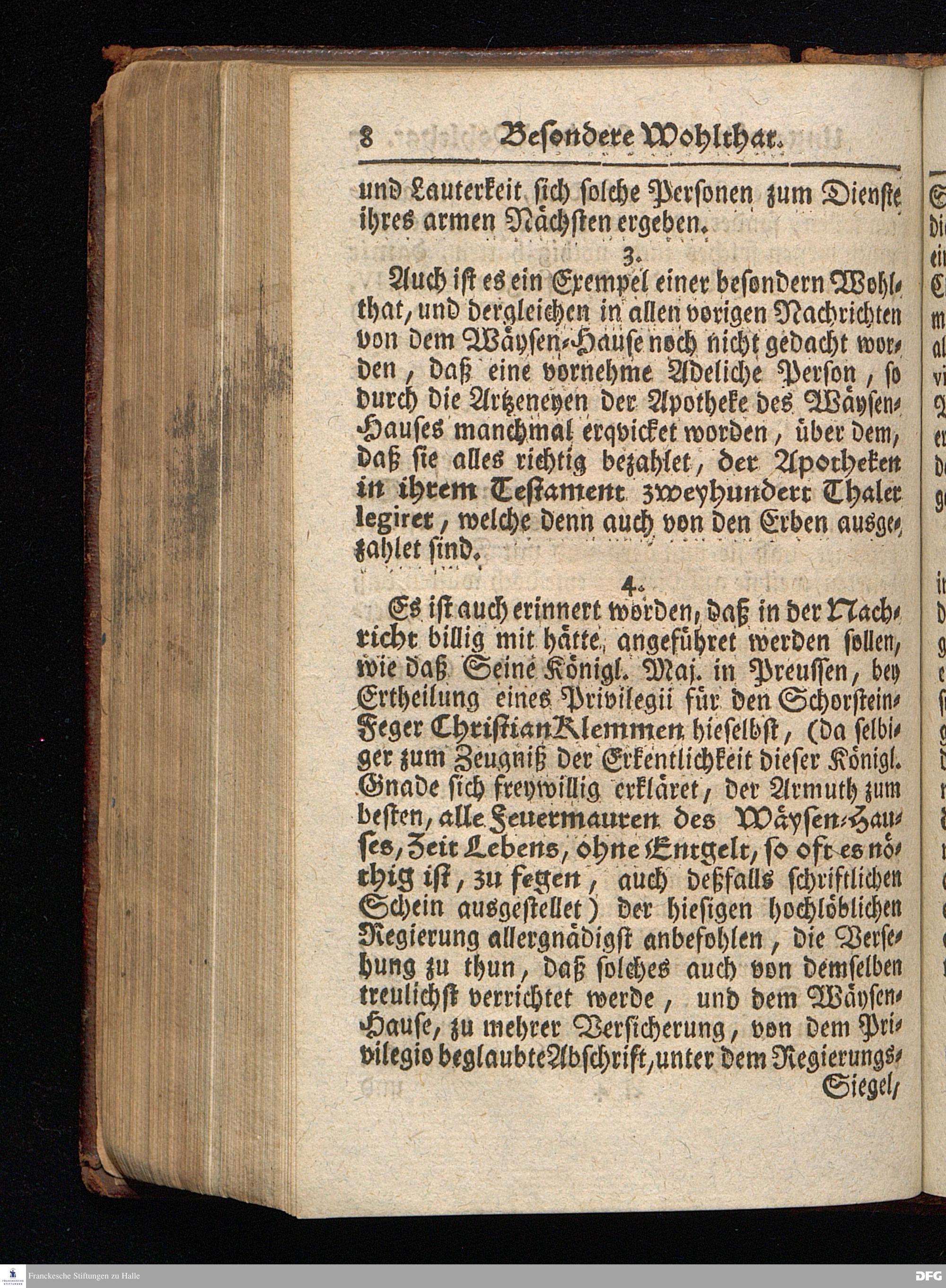 Segens=volle Fußstapfen des noch lebenden und waltenden liebrei=│chen und getreuen GOttes, Zur Beschämung des Unglaubens und Stärckung des Glaubens, entdecket durch eine wahrhafte und umständliche Nachricht von dem Wäysen=Hause und übrigen Anstalten zu Glaucha vor Halle; Welche Im Jahr 1701. zum Druck befördert, ietzo aber zum dritten mal ediret, und bis auf gegenwärtiges Jahr fortgesetzet von August Hermann Francken, S.Theol.Prof.und Past. HALLE, in Verlegung des Wäysen=Hauses, MDCCIX.